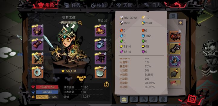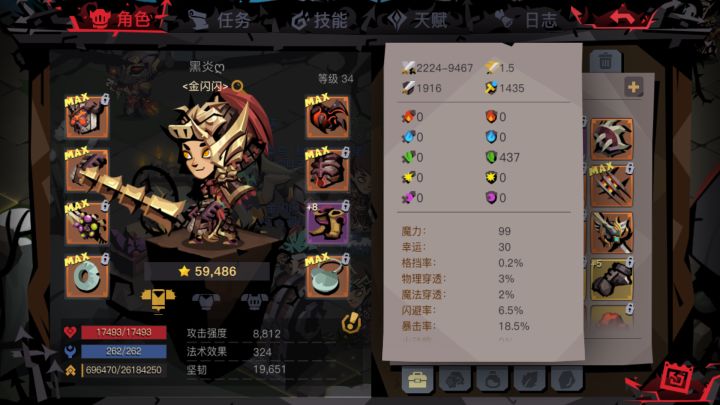 真香。属性如图,肩膀没光,项链3爆暗攻,全身三孔都是光暗暴击符文。做日常顺手练练二阶段反击。三连击全暴27775伤害,不过这估计是小概率爆发事件了,毕竟是受最大最小影响的技能。护甲400多的151盖亚。现在属性奶一口4800多,反击盾3400多。暴击20就可以出群盾。加大剑技能到25就放弃群盾。似乎可以考虑试试单刷暗金五了。
