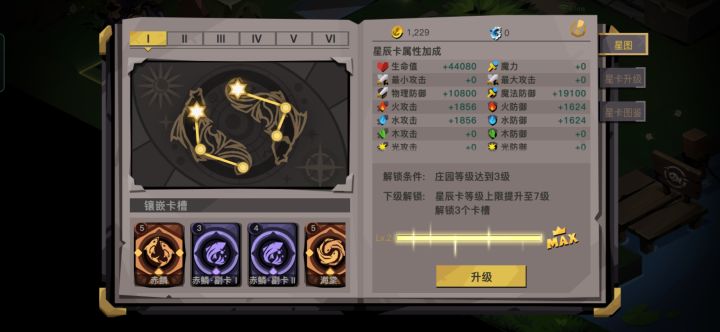 今天更新庄园,关于星辰卡的放置去探索了一下全部橙卡紫卡的属性图海棠:生命、魔防赤鳞:生命、物防巨蟹:最大、物防(大剑)黎明:生命、最大(大剑)天马:魔力、物防(法师)双蛇:魔力、魔防(法师)朱雀:全元素攻击、全元素防御重明:生命、全元素攻击黄昏:生命、最小等级加成的话一共是五级,很多没钱升级的就看大家分享出来了还有两天中秋节提前祝大家中秋节快乐