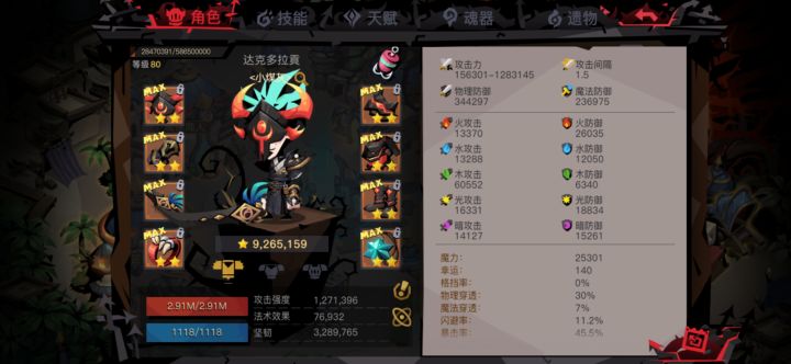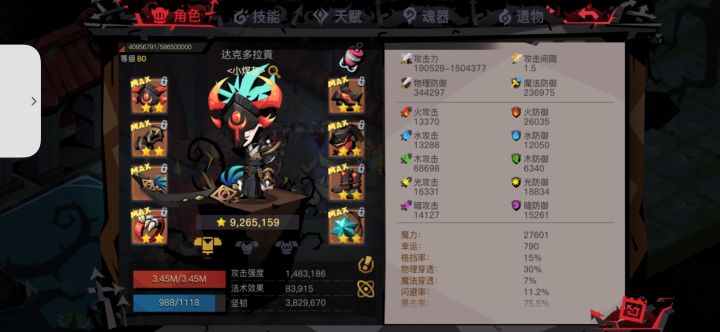 左边是进图属性,右边是最终过精九属性,最后一层吃了攻击和暴击符文打boss就完全没压力了😃