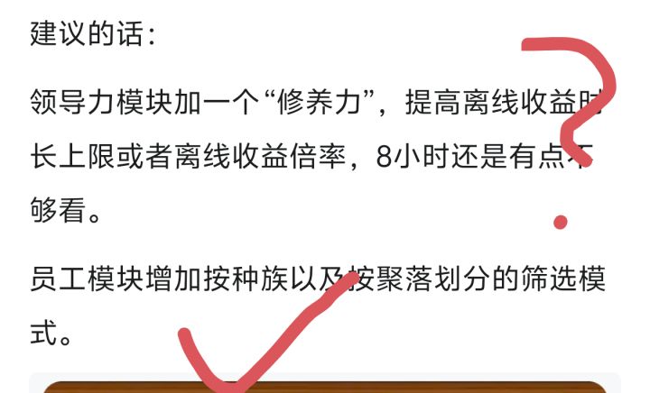 我在清理手机截图时,翻到了去年4月给本游戏评论,目前来看筛选功能确实是实装了。给#去魔王城上班 作者点赞但不考虑提升离线收益倍率的话,也对标《魔王归来》,把提升离线时长的功能也尽快更新进游戏吧,8个小时真的很僵啊