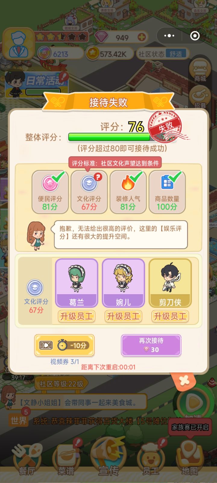 昨天中午玩的时候还是正常的,那时候集赞宝箱进度到了1000,剩下两三百想等晚上九点左右肝,结果两个小时都没凑齐,我真绷不住了。今天周四家族赛也开始了,按照上周进度这种任务我最差可达到70左右,可这满意度才35,我玩集贸啊宝宝,你看这合理吗,这是我号中毒还是专业度不够呀。。。。