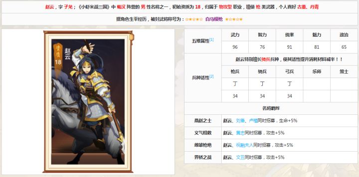 白马银枪赵云,纵观三国风游戏中,这个知名武将可谓是家喻户晓,超热门之选,,在《小虾米战三国》中也不例外(我第一次玩也是选的蜀国,主C赵云)赵云依旧是超人气选手,相比较于实力的话,在橙色品质武将中也算是数一数二的(较为遗憾的便是,从历史背景设计的武将,他没有并入红将之列,稍有遗憾),在未经数据调整之前,赵云的实力比较一些输出类红将也是不遑多让,可惜公测后同典韦一样经过数据调整,虽说并没一落千丈,但