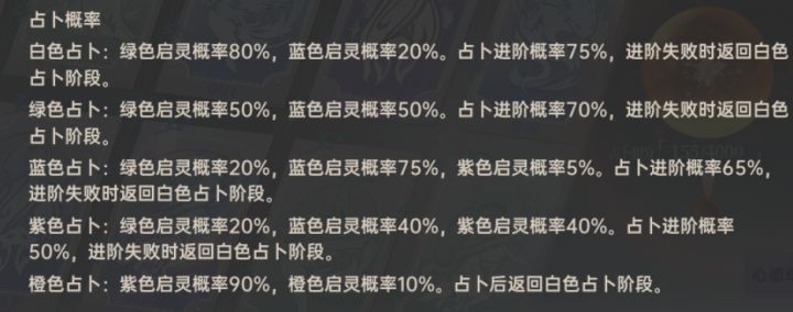 万抽期望为82张(含保底),每张期望消耗为10408算的粗略概率,可能存在计算错误之类的问题,仅供参考,下面是推导过程用马尔可夫链先计算出各占卜概率分布(图四),再进而计算橙启灵的概率(图六第一位,矩阵a11),均保留小数点后四位。根据官方规则可以列出图三,然后得出无保底下各占卜的概率(图四)为白35.88%,绿26.91%,蓝18.84%,紫12.25%,橙6.12%保底这边用4000分
