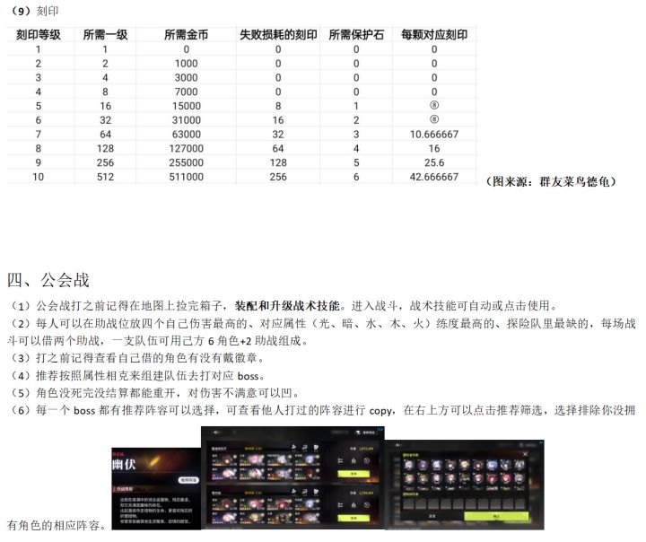 2. 角色选择与培养2.1 角色分类及优先培养● ⭐ 一星(绿卡) ○ 贡献率:≈0%○ 说明:一星角色一般为开局赠送,仅用于凑数;属性低、技能单一,不具备长远培养价值。○ 示例:安妮斯(辅助效果一般)、蒂娜(坦克但身板脆)、菲尼斯(无培养价值)。● ⭐⭐ 二星(蓝卡)○ 推荐培养比例:< 5%○ 说明:蓝卡角色整体实力偏低,仅在特定副本或工会战中具备对策价值。○ 数据参考:希尔