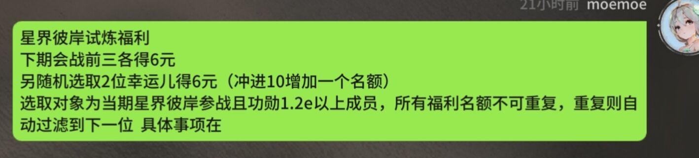 星界彼岸收人,排名可稳定前20,上期功勋1e即可公会有多位大佬,气氛活跃,且每期公会战都有福利红包,有意愿的私聊申请,欢迎各位大佬加盟,不打公会战的勿扰😊