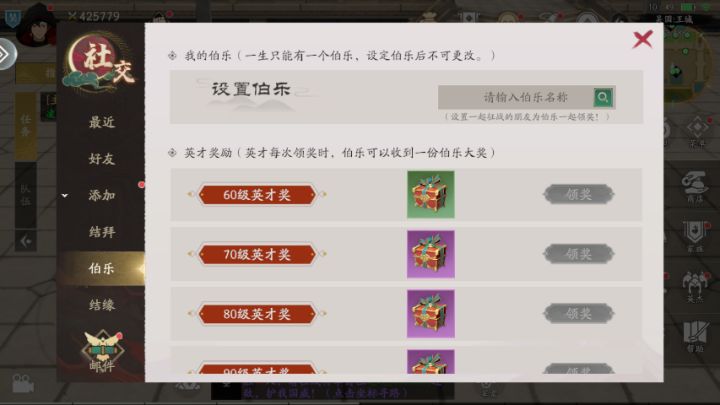 伯乐:1、角色60级时,开启伯乐;2、发现您并与您一起征战全战世界的人可成为您的伯乐;3、当英才达到一定的等级时,英才领奖的同时伯乐也可以获得一份奖励;每个将军一生只能有一个伯乐并且不可更改,但可以成为多个人的伯乐。#攻略#新手推荐#国战手游#全战纪#社交游戏