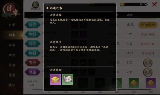 1. 不速之客是国家级别大团本,玩家达到65级可以与所有本国玩家一同参与,可以通过日常进入副本击退来自外域的侵略,通关后根据通关速度对国家进行排名,奖励丰厚,且有限定称号。2、副本开启时间为每周五、周日晚上20:30,最大持续20分钟,该副本不限进入与退出的时间与次数,可在结束前随时加入战场;3、击败外域的北漠将军后,副本将会结束,并根据各个国家通关副本所消耗的时间进行排名国家所有玩家将会根据