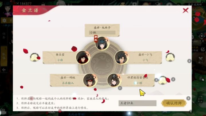 结拜条件1、同一个国家的将军组成队伍,并且队伍成员两两之间互为好友。2、所有队伍成员全都没有结拜关系。3、所有参与结拜的将军全都在龙隐村“金兰”附近。结拜流程1、参与结拜的将军组队并由队长领取结拜任务。2、结拜时,结拜队伍不能有人员变动,否则无法结拜。3、结拜过程中,由队长输入结拜名称并起个称号,其他队员只需要输入自己的称号。4、当队长确认结拜后,若队员两分钟内迟迟不点击确认结拜,