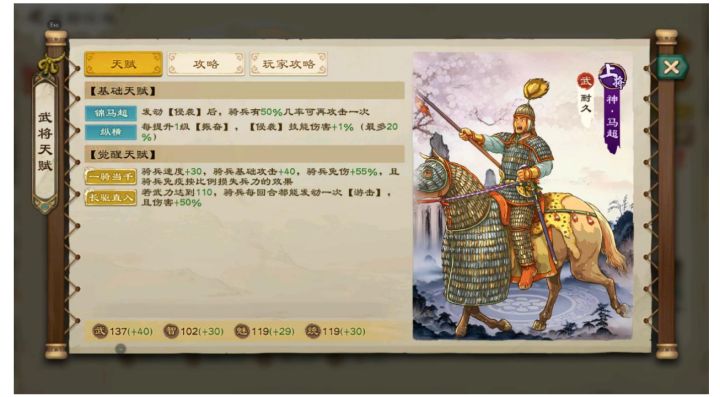 感谢玩家咩国靓坤供稿~ 建议想玩马超的提前考虑好,这个武将算是整个游戏里最有特色的武将,没有之一。不碰到 贾诩的时候谁都能打,碰到贾诩被越战几百万是很常见的事。 0 合养成--0 合总体思路攒资源的同时围绕马超针对性的升级 升星:开区的时候马超是最容易成长的武将,新手跟着任务就可以拿到碎片升星,随着时间 推移府邸升级围猎、聚贤、武魂商店等都能拿到碎片,升红难度较低。技能:马超基础智力