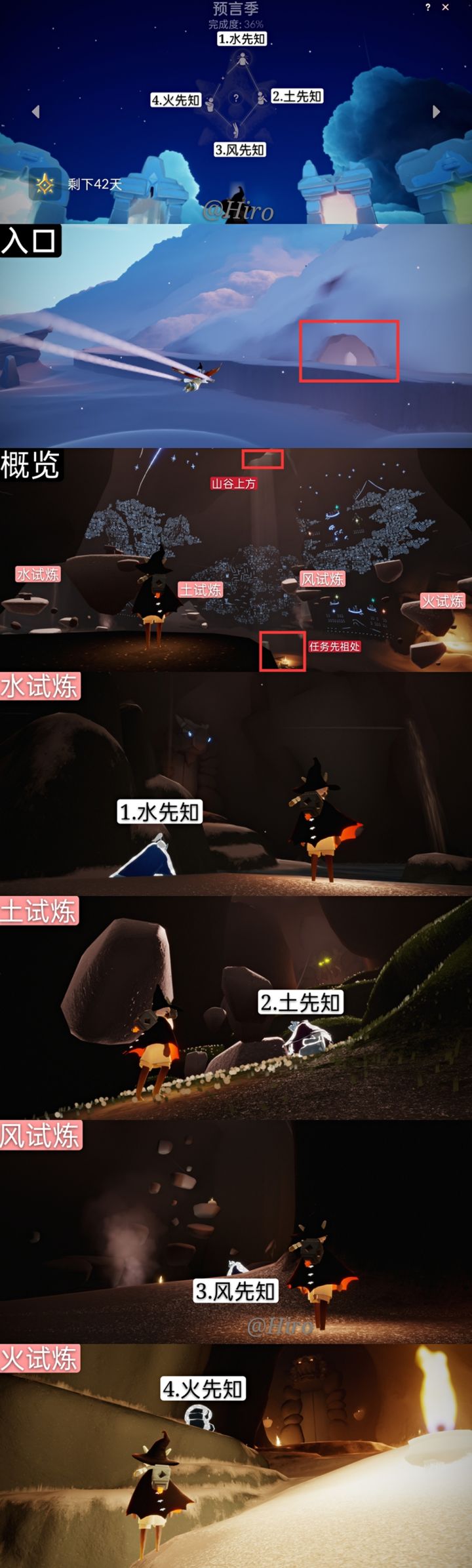 观前须知:①所有图片从测试服截取,若正式服有改动再更新。②如有错漏欢迎指出。导航:地图概览→试炼机制介绍一.地图概览本次新图从晨岛的云层堆右下方进入,山谷内部由四个洞穴+上层构成,每个洞穴的试炼对应先知的属性:另外,山谷上方有一堆蜡烛,还可穿过顶部云层俯瞰山谷全貌:二.试炼机制新季将采取新的主线玩法:每个先祖对应一种闯关地图(试炼),具有一定的难度,建议多人合作通关。——关卡特