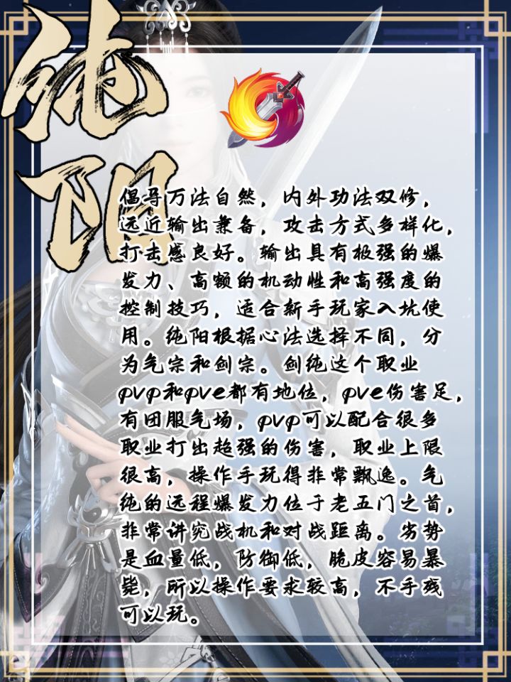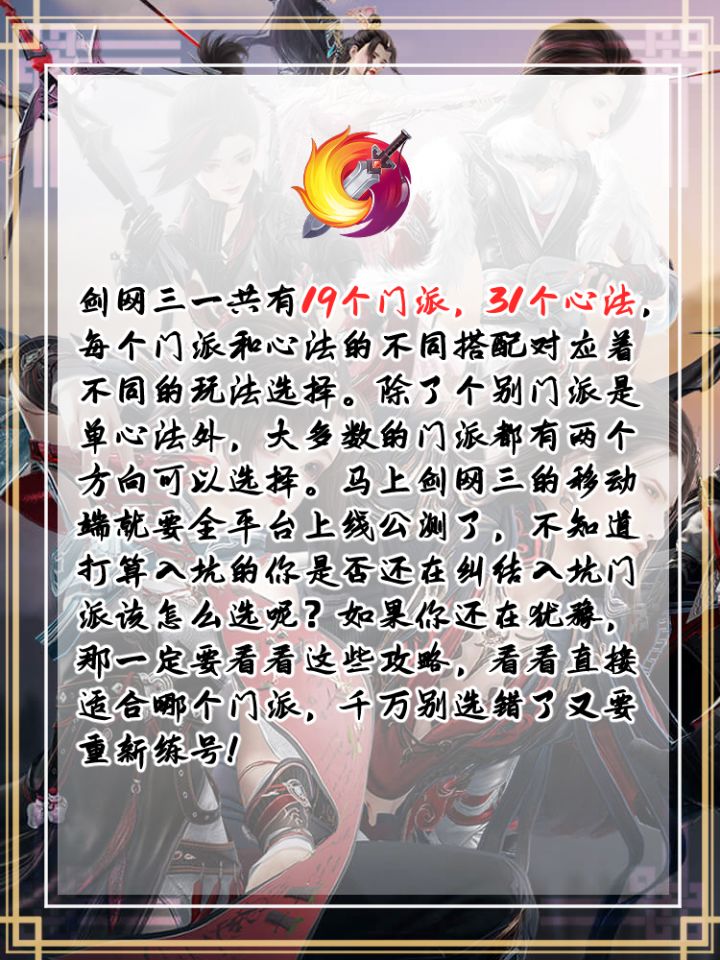 剑网三一共有19个门派,31个心法,每个门派和心法的不同搭配对应着不同的玩法选择。除了个别门派是单心法外,大多数的门派都有两个方向可以选择。马上剑网三的移动端就要全平台上线公测了,不知道打算入坑的你是否还在纠结入坑门派该怎么选呢?如果你还在犹豫,那一定要看看这些攻略,看看直接适合哪个门派,千万别选错了又要重新练号!一,纯阳倡导万法自然,内外功法双修,远近输出兼备,攻击方式多样化,打击感良好。输