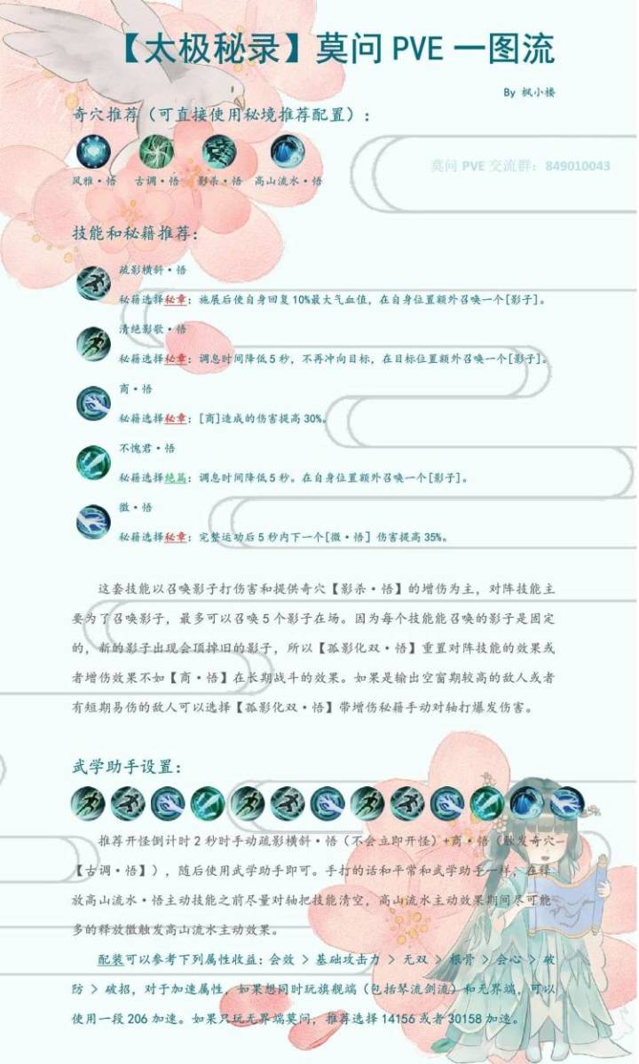 无界莫问的输出以傍身招式和影子为主,技能需优先选择三个可以召唤影子的技能,最好一个技能推荐选择可以增强莫问自身伤害的技能【孤影化双·悟】或性价比较高的伤害技能【商·悟】,在敌人处于【高山流水·悟】技能影响下时优先打【琴音】技能触发【高山流水】效果。起手前先释放【疏影横斜·悟】,随后使用【商·悟】开始战斗同时触发奇穴【古调·悟】的【绕梁】效果,之后释放【清绝影歌·悟】【不愧君·悟】使场上影子达到最