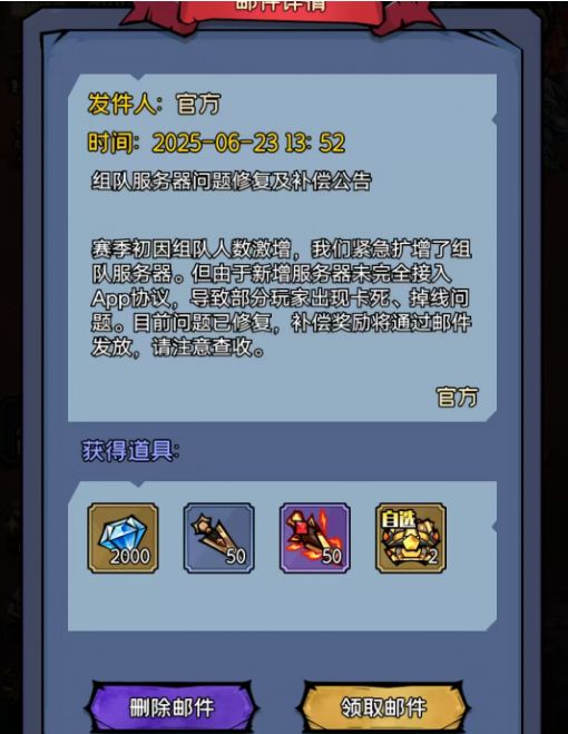 组队服务器问题修复及补偿公告赛季初因组队人数激增,我们紧急扩增了组队服务器。但由于新增服务器未完全接入App协议,导致部分玩家出现卡死、掉线问题。目前问题已修复,补偿奖励将通过邮件发放,请注意查收。感谢大家的理解与支持!