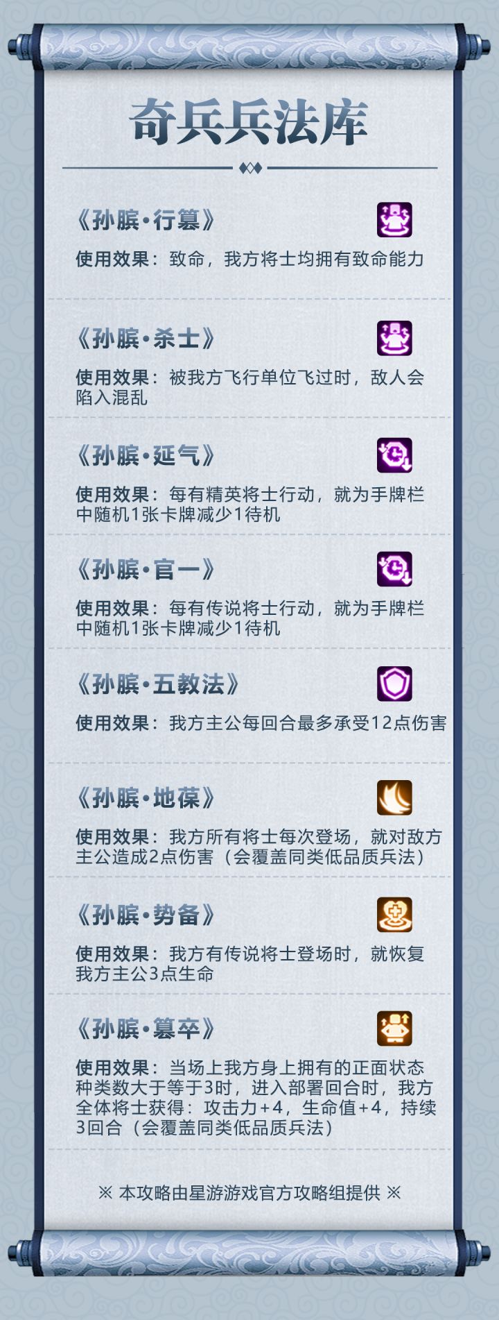 今日【奇兵兵法库】继续来介绍【孙膑】兵法哦,紫金品质的【孙膑】兵法,能给将士增加额外的buff呢!快来看看吧!