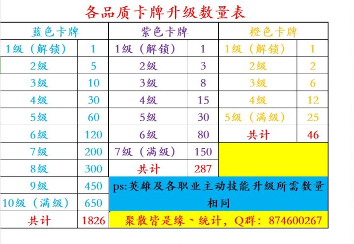【数据攻略】各等级卡牌升级数量表