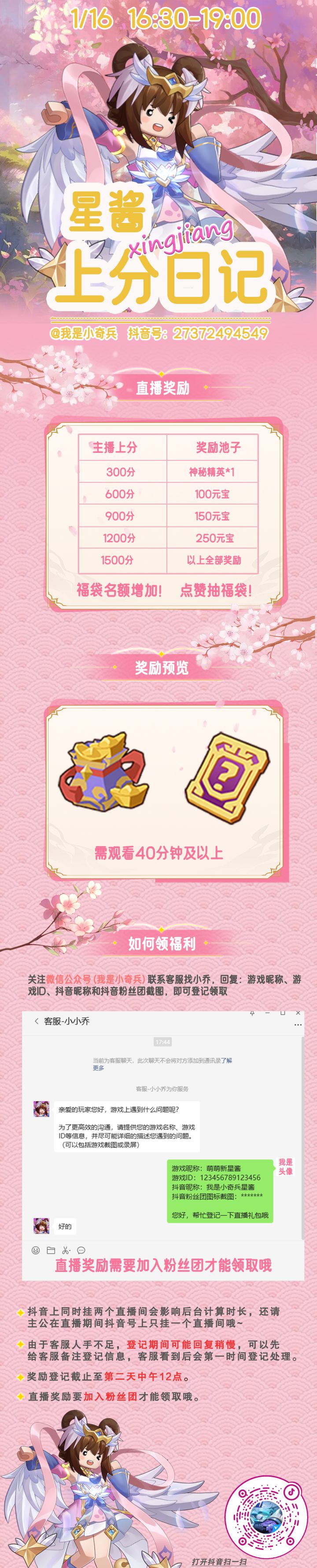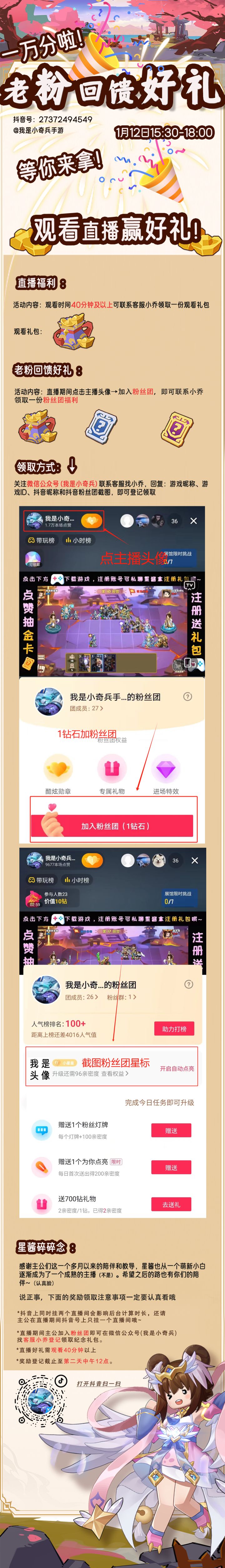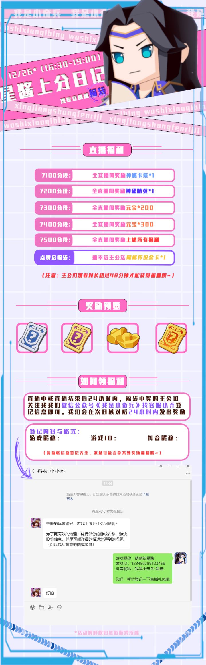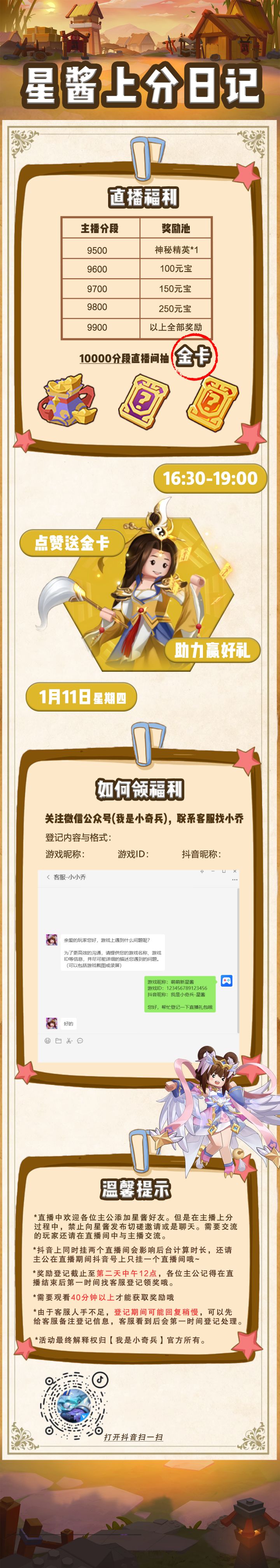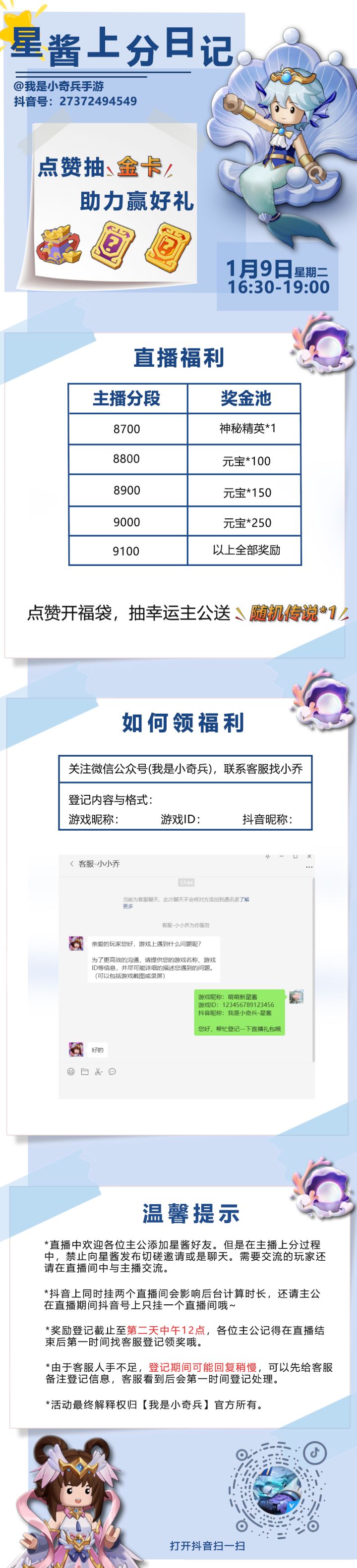 直播时间:12月21日17:00-19:00直播间:《我是小奇兵手游》官方直播间直播福利两重礼:1.星酱冲分到指定分段,在直播间观看直播的主公即可获得“助力福利”:直播结束后星酱在6200分段:全直播间奖励神秘卡集*1;直播结束后星酱在6300分段:全直播间奖励神秘精英*1;直播结束后星酱在6400分段:全直播间奖励元宝*100;直播结束后星酱在6500分段:全直播间奖励元宝*150