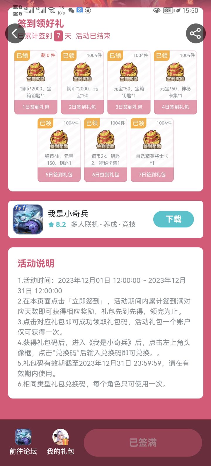 今天签到的礼包码就用不了了……