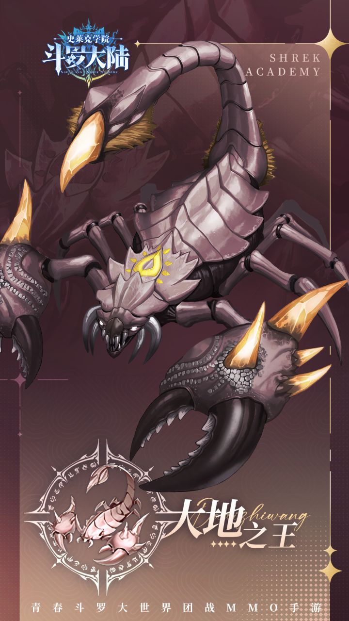 大地之王是出没偶遇森林和山地区的大型蝎类魂兽。它嗜杀成性,虽然不像人面魔蛛的剧毒那么令魂兽畏惧,但同等级的魂兽却少有敢招惹它的。大地之王暴躁易怒,能够驾驭火焰之力,再加之其坚实的外壳,各位学员在狩猎前需要做好充分的准备哦。