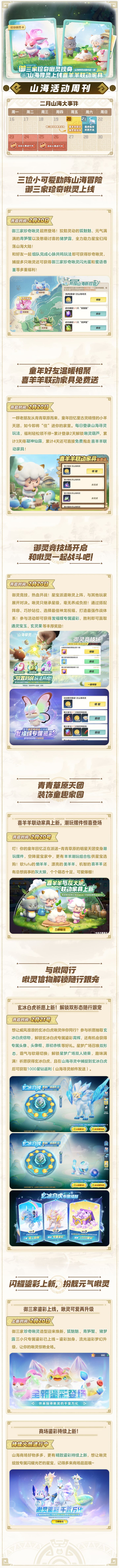 家园焕新进行时,来自青青草原的暖心好礼正在派送,小羊天团为你装点童趣小屋~御三家珍奇啾灵重磅登场,战力全面提升,助力星宝驰骋战场!更有御灵竞技场热血开战,带上啾灵并肩作战,同台竞技一决高下!祈愿赢取玄冰白虎信物,星梦广场解锁双形态,额外带走限定鎏彩,还有机会获得专属头像、头像框、养成材料等多重好礼,在山海寻灵中捕捉到玄冰白虎后还可获取1000星钻返利(山海寻灵邮件发送)!