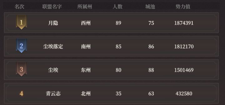 一转眼,首批开放进入S2的区服已经经历了一周的鏖战了,以1区巧盗天机服务器为例,目前各州基本都渡过了攻城略地的阶段,完成了盟与盟之间的吞并,各州巨头已然浮出水面。我们先来看下目前势力榜的排行状况吧。先来看看目前榜上前4基本就代表了东南西北四个州的霸主联盟,分别是来自西州的月隐联盟,来自南州的尘埃落定联盟,来自东州的尘埃,以及来自北州的青云志联盟。其中尘埃落定则为尘埃的分盟。 比较出乎人意料