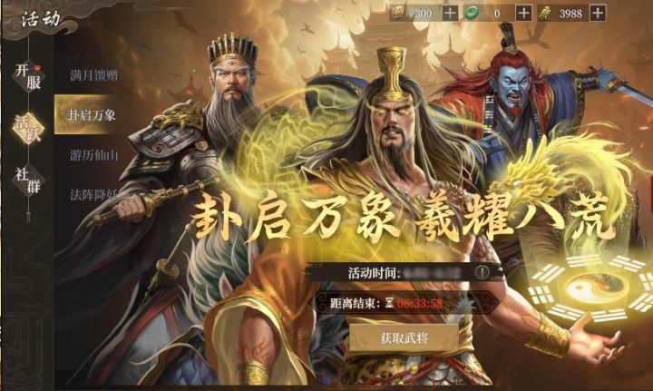 卦启万象,羲耀八荒。五一主题活动即将上线,参与活动不仅获得丰富的金贝、抽卡卷等奖励,全新的限时卡包【卦启万象】也同步与大家见面!卡包不仅包含闻仲、吕岳等当期热门武将,还有核心人物角色伏羲强势登场~活动具体详情请随毛毛一起来看看吧!卦启万象活动活动时间:5月1日-5月5日卡包展示:上古天皇·伏羲历史背景:伏羲,华夏民族人文先始,三皇之一,即太昊,或称黄熊氏。神话中人类的始祖。相传为风姓,又