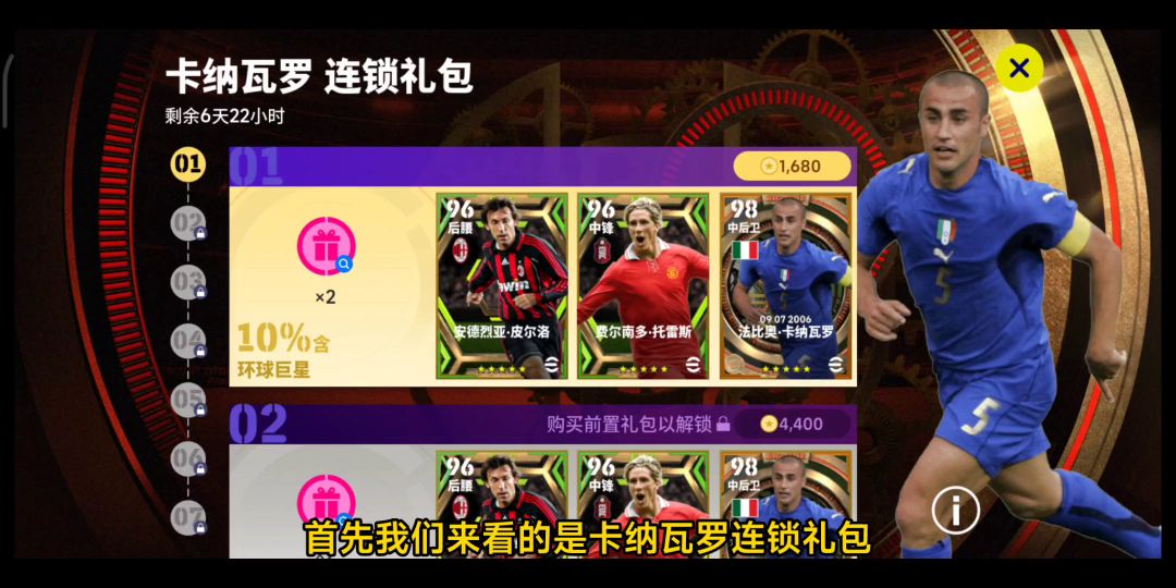 5w金币,8个时刻,保底一个卡纳瓦罗,相对来说还可以,有保底。 前两档可以博一下白嫖,1680金币可以接受。里面也有很多巴萨队套球员,还有时刻维埃拉。#宝藏游戏安利派对#实况足球双节同庆#实况足球手游#实况足球五周年#实况足球攻略#1221卡包活动简析