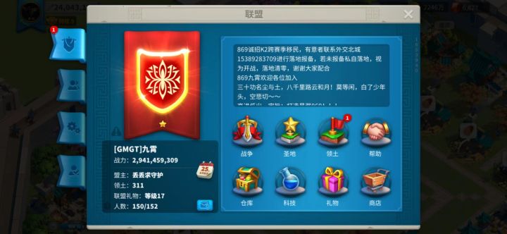 869是一个氛围感十足的国家,我们有着一群敢打敢拼的兄弟,还有一帮可爱的妹子,注重玩家游戏体验,人性化的管理模式 公平公正的奖励分配机制,在这你可以体验到快意江湖的热血豪情,也能感受金戈铁马的壮怀激烈,目前K1因盟友870的帮助已经成功摘星,不久又将再起新的征程,目前跨赛季预约报备人数爆满,静待特通大佬与同赛季兄弟们的光临造就新的辉煌!!!有意者可联系外交北城(V):15389283709外交遗