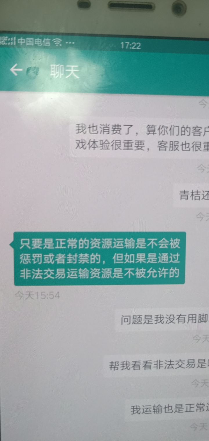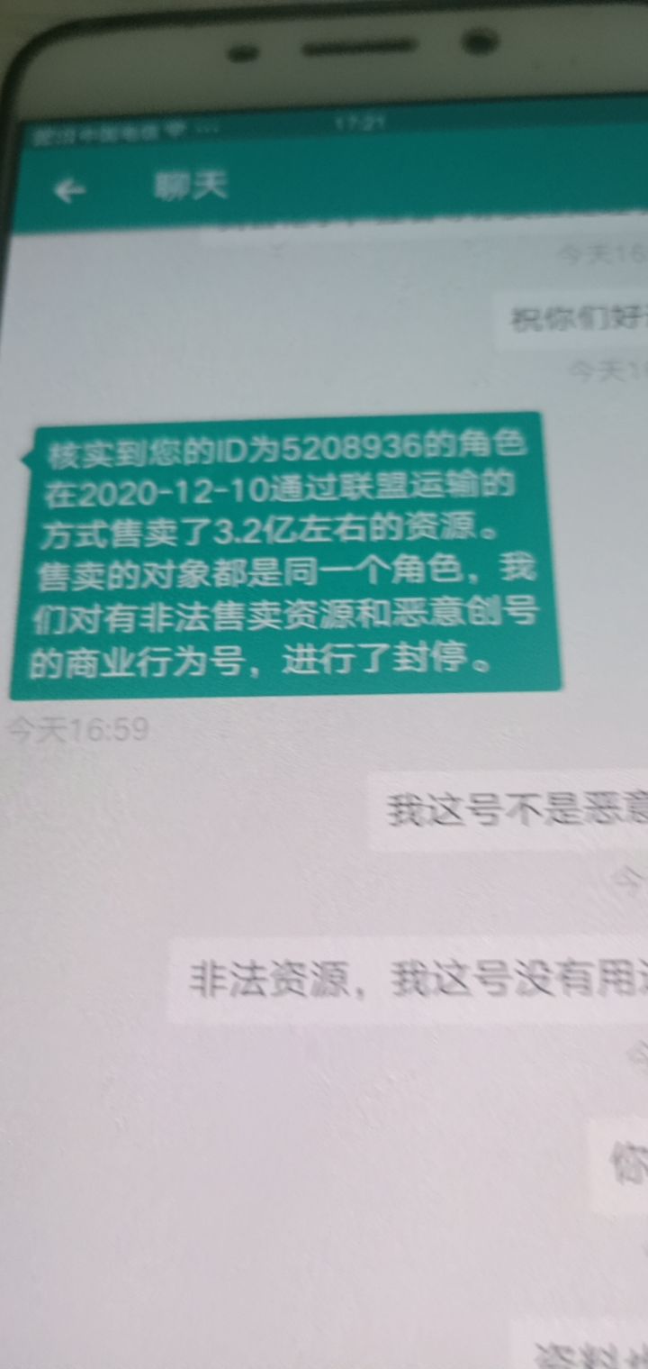 昨天13点我的号被封 ,跟客服反映 说我非法交易,我问客服我啥时候非法交易告诉前天交易资源,但是我确定 一定以及肯定我的号没有用过脚本,正常运输,该客服还说正常运输不会被封,我让他在多查几次,,后来客服说我创号异常,我是手机跟平板玩的2个月的号了,说我创号异常,还说我非法交易,我给我大号资源,就是非法交易,让其给出证据,问其我非法资源来源,哪天,结果就没有回复了 ,就在敷衍我,通过以上聊天行为,我确认,他们恶意封号,还不给处理,就因为我最近充钱少,一次运输的资源3.2亿,就封号大号,跟资源号,最后也没有解决,而且是直接封3天资源号22级的 也充钱了的,大号直接封一天,警告也没有,说我非法交易 ,那么手动资源也是非法的话,那么多大佬号都在每天收资源,他们该封多少次了,就因为我最近充钱少,直接封我 ,给我来个欲加之罪何患无辞!真心对这游戏失去了兴趣,不吐不快