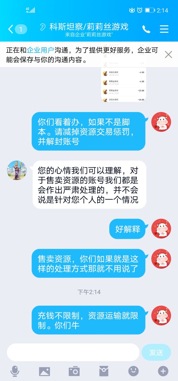 玩这个游戏也已经快半年了,不能说这个游戏好也不能说不好。但是这个脸却不不要,玩了这么久一次脚本都没开过。却被人说成恶意售卖资源,什么好话都被游戏的自己人说了。行,如果有这个决心。那么请对那些恶意充值的玩家也来限制呀。把我们这些没钱的往死里逼,对于有钱的人一点限制都没。现在不要求退钱只要求给我个解释,不然就投诉到底!