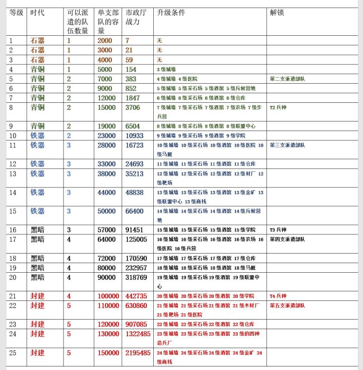 Hello 大家好!我是来自1454的Rise of Dollar,在这里给大家带来一篇主堡升级攻略!主堡,也就是市政厅,是前期游戏最重要的一个建筑物,以下就是升级条件以及升级后的改变。从以上的信息可以看出,市政厅等级越高,好处多多!不仅能够解锁和升级更多的建筑物,还能增加可以派遣队伍的数量。随着派遣队伍数量的提升(最多五支部队),大家采集的效率也会越来越高!每天更多的资源收入意味着更快的游戏