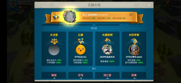 微氪党首选步兵,骑兵弓兵是大佬玩的,前期攒水晶等大转盘把理查一世抽出来,查理马特黄金钥匙可以出,反正我没练孙武,然后多搞步兵,不要囤太多资源,不要把城放到大佬旁边,等到关3出了国王之后整体上就会越来越和谐了,还有最强执政官第五天记得开24小时护盾。