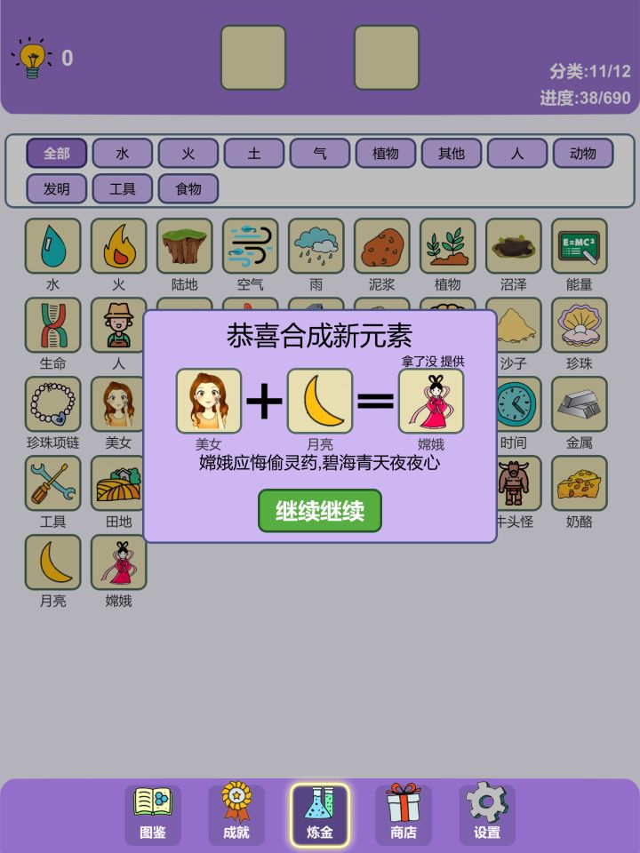 水+空气=雨 水+陆地=泥浆 雨+陆地=植物 泥浆+植物=沼泽 空气+火=能量 沼泽+能量=生命 陆地+生命=人 人+雨=寒冷 雨+寒冷=雪 雪+人=雪人 陆地+火=岩浆 空气+岩浆=石头 火+石头=金属 金属+人=工具 陆地+工具=田地 空气+石头=沙子 火+沙子=玻璃 沙子+玻璃=时间 植物+时间=树 田地+人=农民 树+农民=水果 田地+水果=蔬菜#攻略