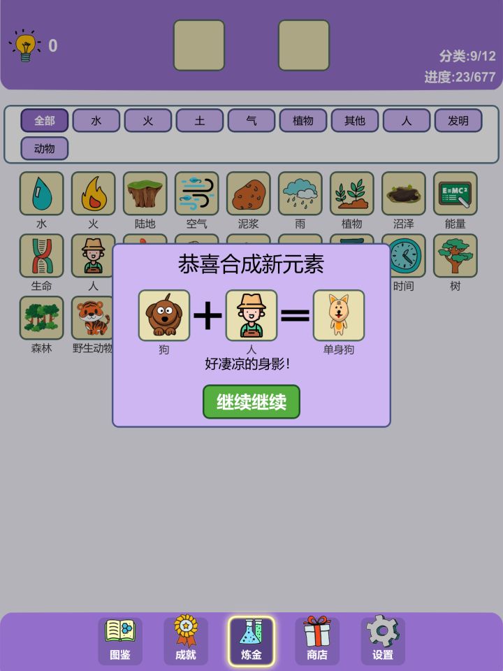 水+陆地=泥浆 水+空气=雨 雨+陆地=植物 泥浆+植物=沼泽 空气+火=能量 沼泽+能量=生命 陆地+生命=人 陆地+火=岩浆 空气+岩浆=石头 空气+石头=沙子 火+沙子=玻璃 沙子+玻璃=时间 植物+时间=树 树+树=森林 森林+生命=野生动物 野生动物+人=狗 人+狗=单身狗#攻略#游戏安利#游戏推荐#游戏讨论#宝藏厂商