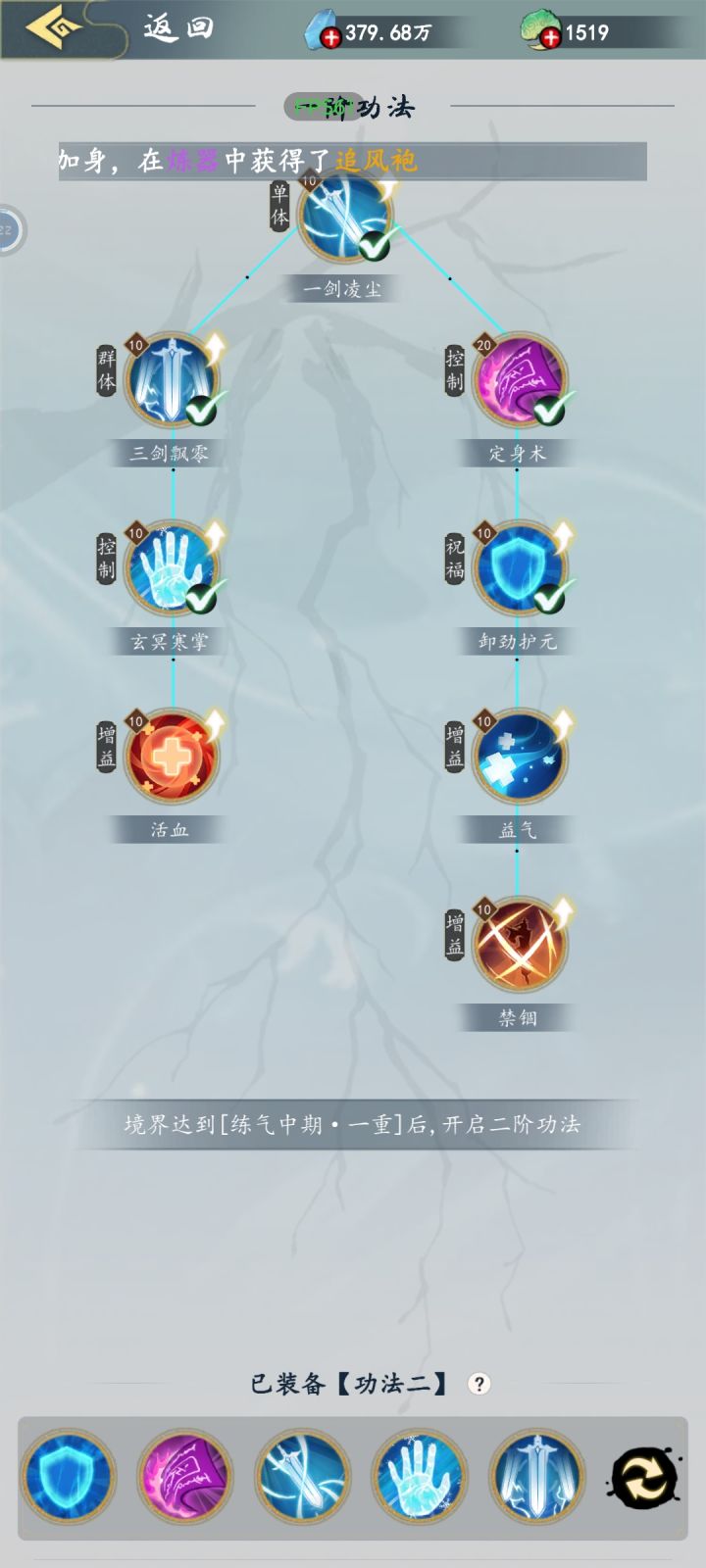 功法是游戏的特色系统,学习需要境界和前置功法等级需求,消耗残页进行升级。总共有三阶功法,每阶有八个,每十级需要突破才能继续升级,突破消耗功法总纲,这个很珍贵,只有灵玉商店和无尽深渊出,所以商店刷到一定要买。游戏第一天一阶功法全部学到10级,然后把三剑和定身突破,学到20级,接着学第二阶的功法,功法至少都得学到10级,但是突破需要总纲,所以要慎重突破,避免浪费总纲,总纲不足就去打无尽深渊,或者看看每
