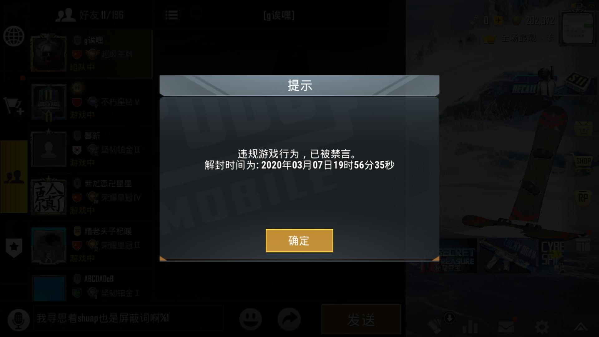 刷 屏,开 挂都是禁言?第一次给我禁一小时也就算了这次直接禁一天???你把违禁词告诉我们啊直接一天???我开不了麦你让我怎么玩???
