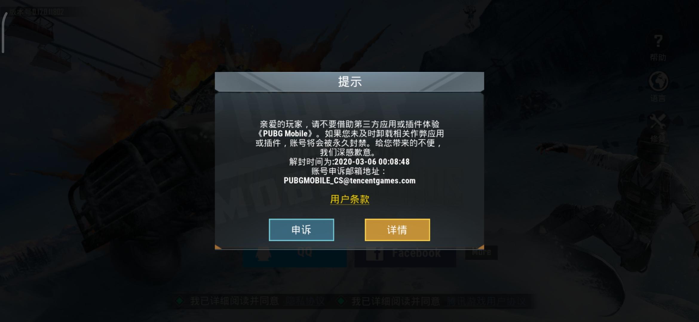 我的吃鸡国际服账号在2019年11月26号被无缘无故封禁10年,官方未给出任何解释,申诉也没有任何回复,发了邮件也只是冰冷的机械回复。我真的只是一个普通的菜鸡玩家,打了快四个赛季连皇冠都没上过,这样的我也能被叫做开挂?就算说我开挂,你起码也告诉我是在什么时候开挂吧,打了一个下午什么都没发生,突然在最后一把晋级钻石的时候给我封掉,而且第一次就给我封10年我真的懵逼了。我现在真的很绝望,有没有人来帮帮