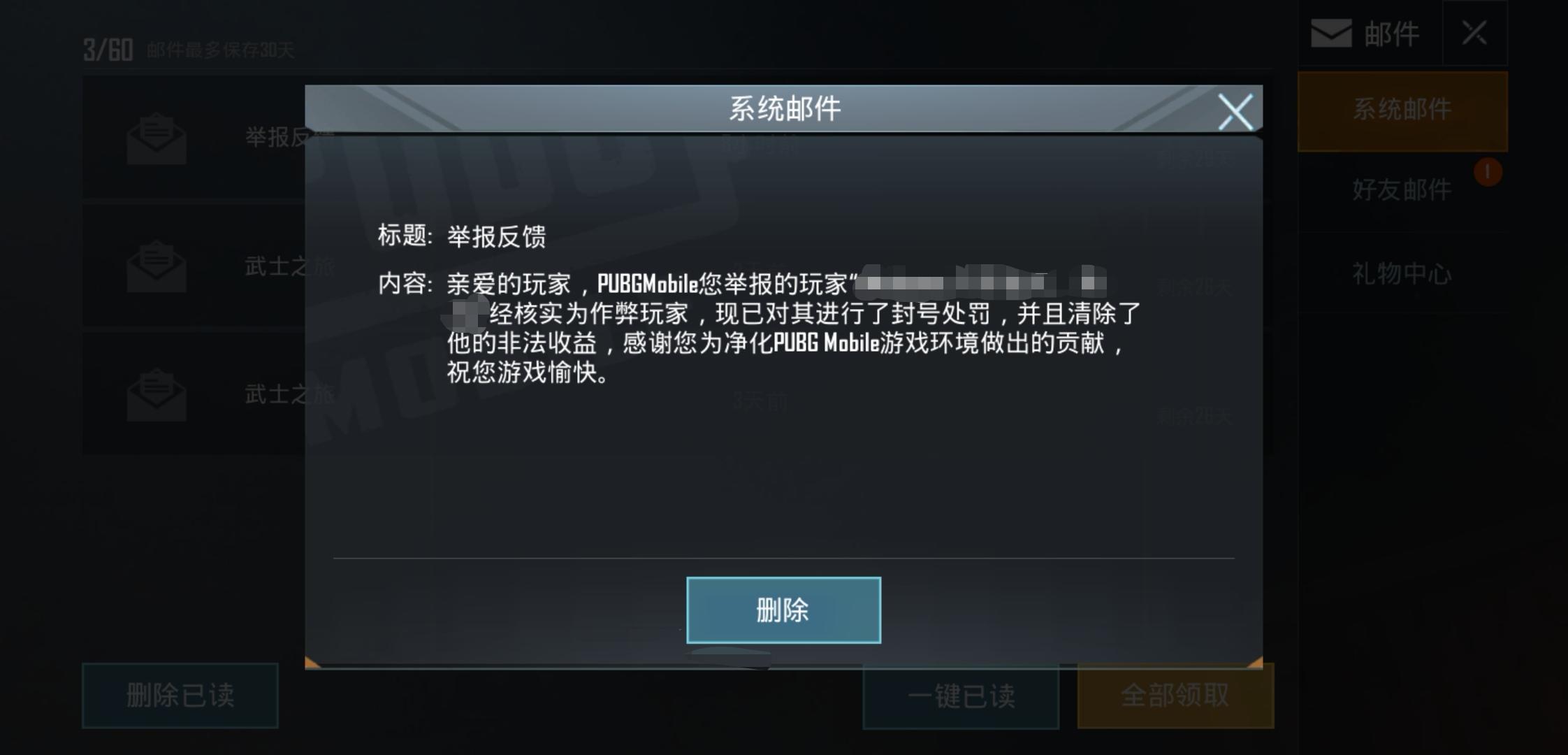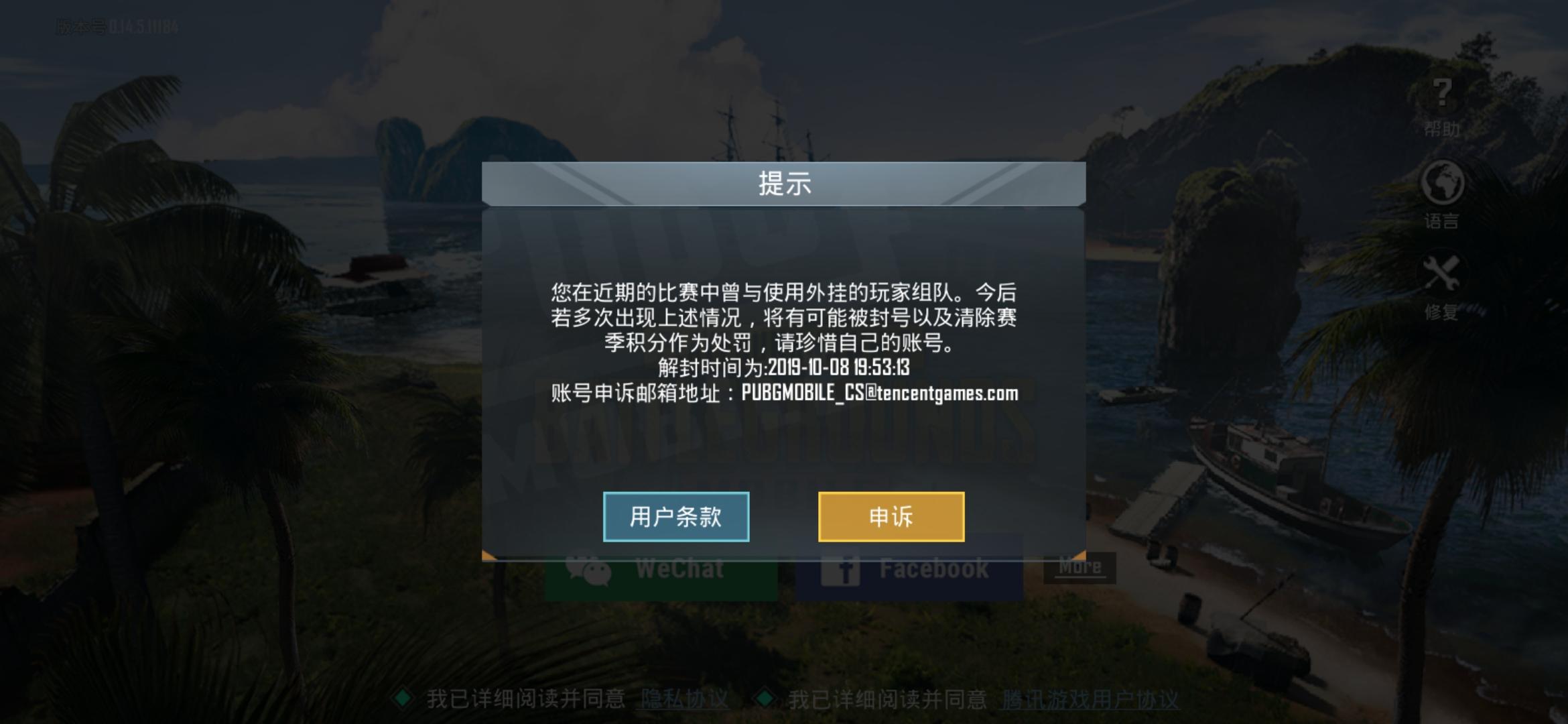 尊敬的特种兵 ,您好!感谢您联系PLAYERUNKNOWN'S BATTLEGROUNDS MOBILE!您的帐号已被禁止(短期/永久),在禁令期限到期前您将无法使用。由于系统侦测到违规行为(例如欺诈、非法外挂、AFK、非法更改客户端文件、透过非官方平台下载游戏、使用辅助器/第三方软体等),导致游戏帐号被禁止,若多次被侦测到以上情形,则为永久禁止。请注意:1. 禁止于第三方平台下载游戏,务