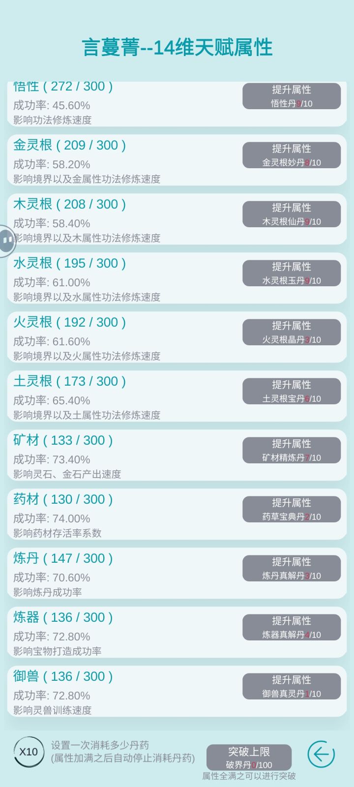 前期14维提升到290不建议再提升了,后面10点直接百分之5的成功率,比从一提升到290还难。还是留着丹药提升别的弟子划算。