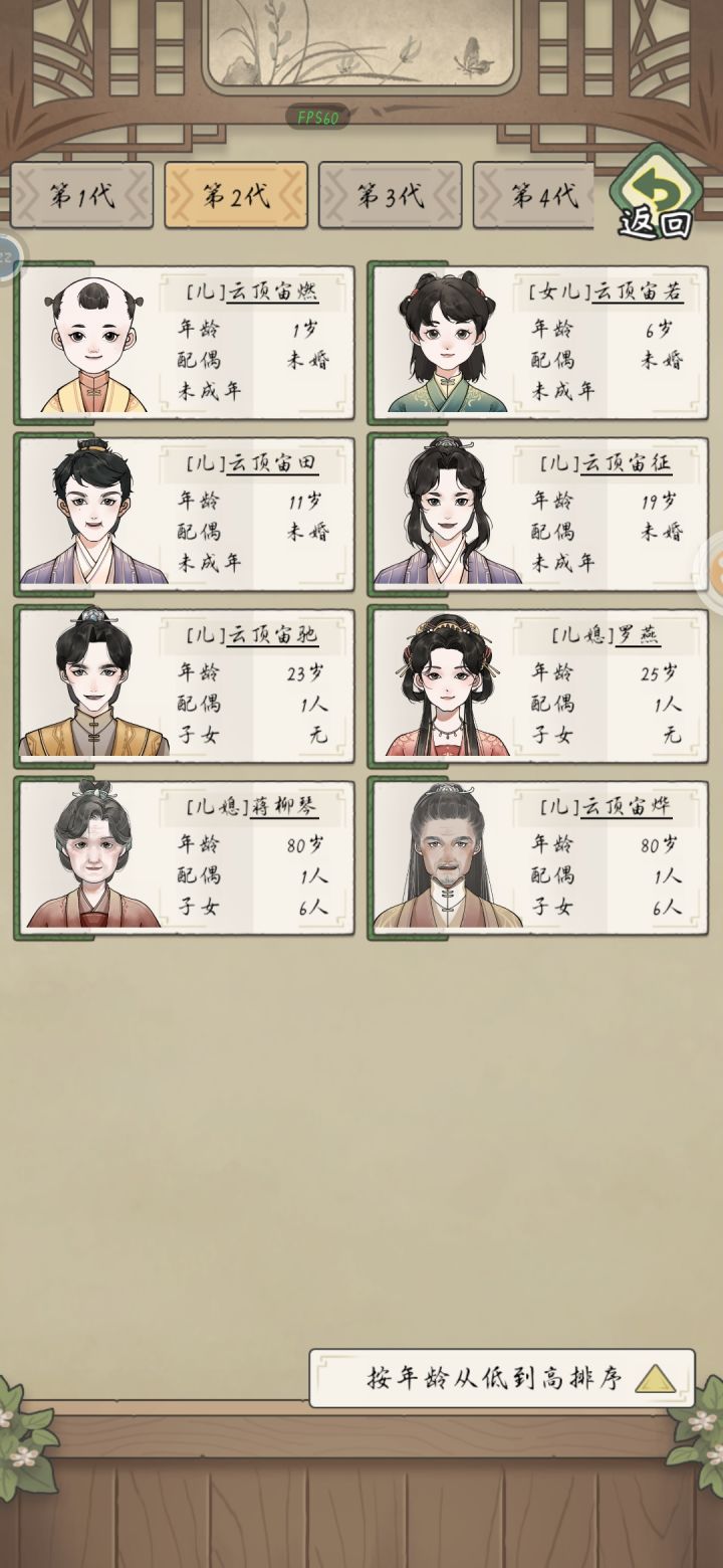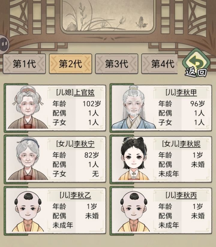 新建家族时一定要选择鼓励生育:每诞下一个后代给3个元宝。冠姓这里推荐选择随自己姓,随父姓或是随母姓,后续角色随父姓女角色或是随母姓男角色到游戏中期,这个人噶了是没有子孙后代可以继承人生的,就像我一样,最后只能选择重开。(成人礼建议20岁,16岁太小啦)选择随自己姓后的角色无论男女出生子女都是随自己姓,开局人物属性,推荐选择比较中和一点的。天资60-70左右。家族字辈字可以随意改,但目前已知,