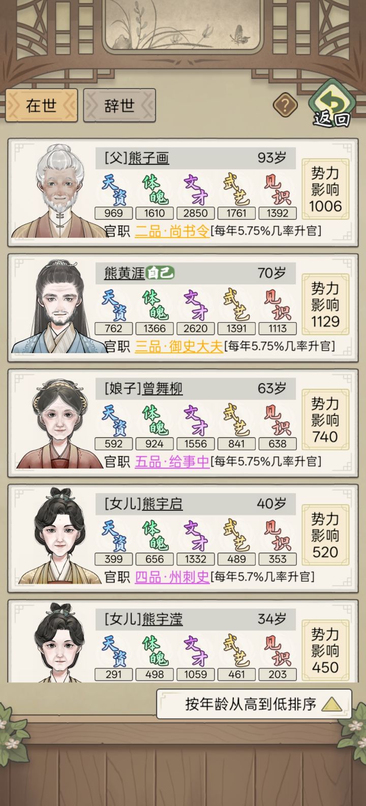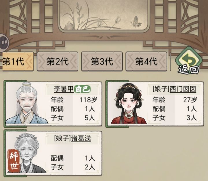 办法:加天资娶新妻(详情如下光顾着让子孙学好文武艺,就没有注意结交天师半仙们,然后慢慢的第四五代的娃娃们都不怎么爱生娃娃了。然后又不小心选了一个三十好几岁的男姓已婚无娃的传承人,之后的几十年,把上一代送走就剩老两口子了,研究了一下他俩的属性我想,是不是能生娃的年纪里他俩的天资太低,现在虽然天资高,但是女方年纪大了已经不给生了?于是我做了下面两个操作。1、得把另一半空出来,然而除了熬死她我没有
