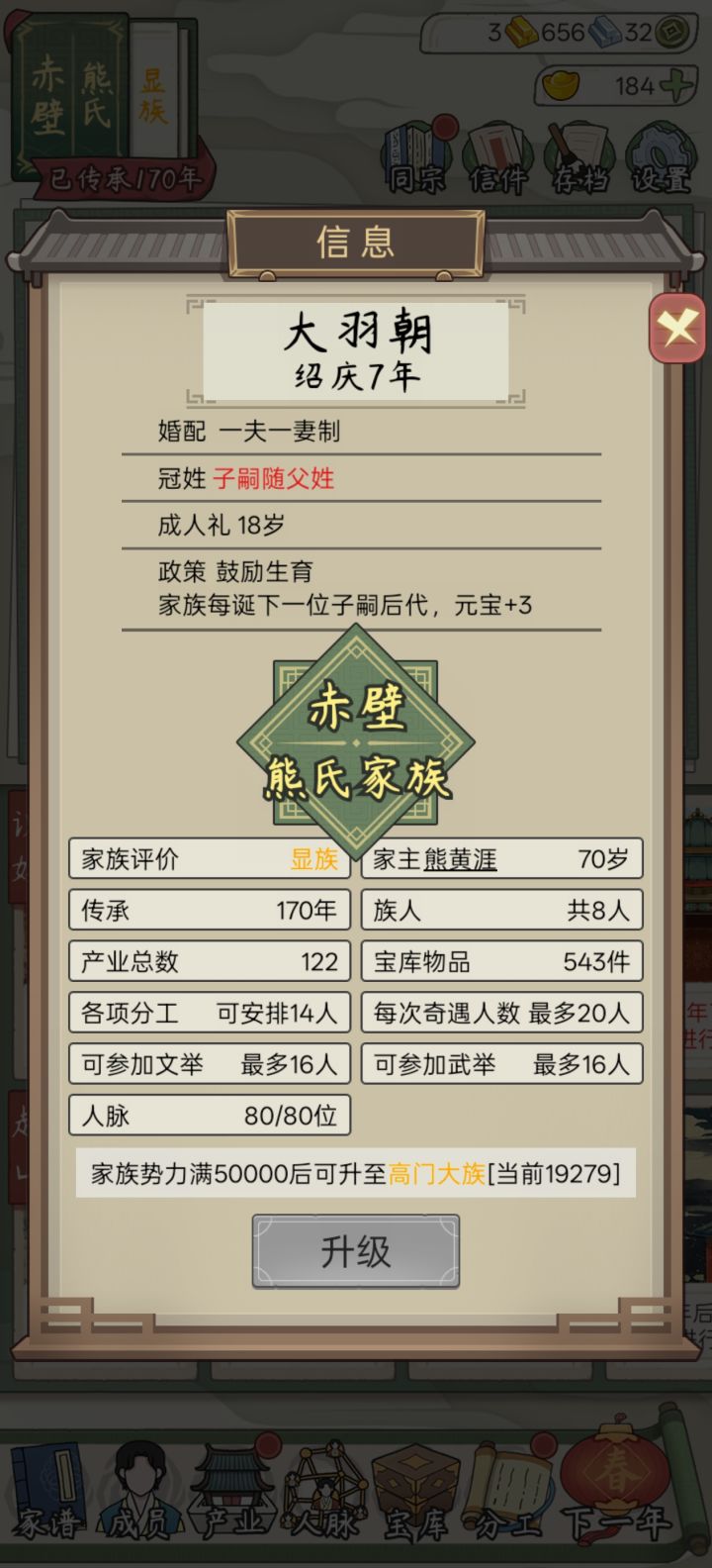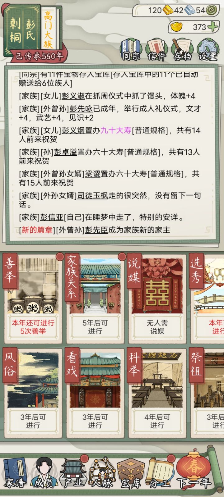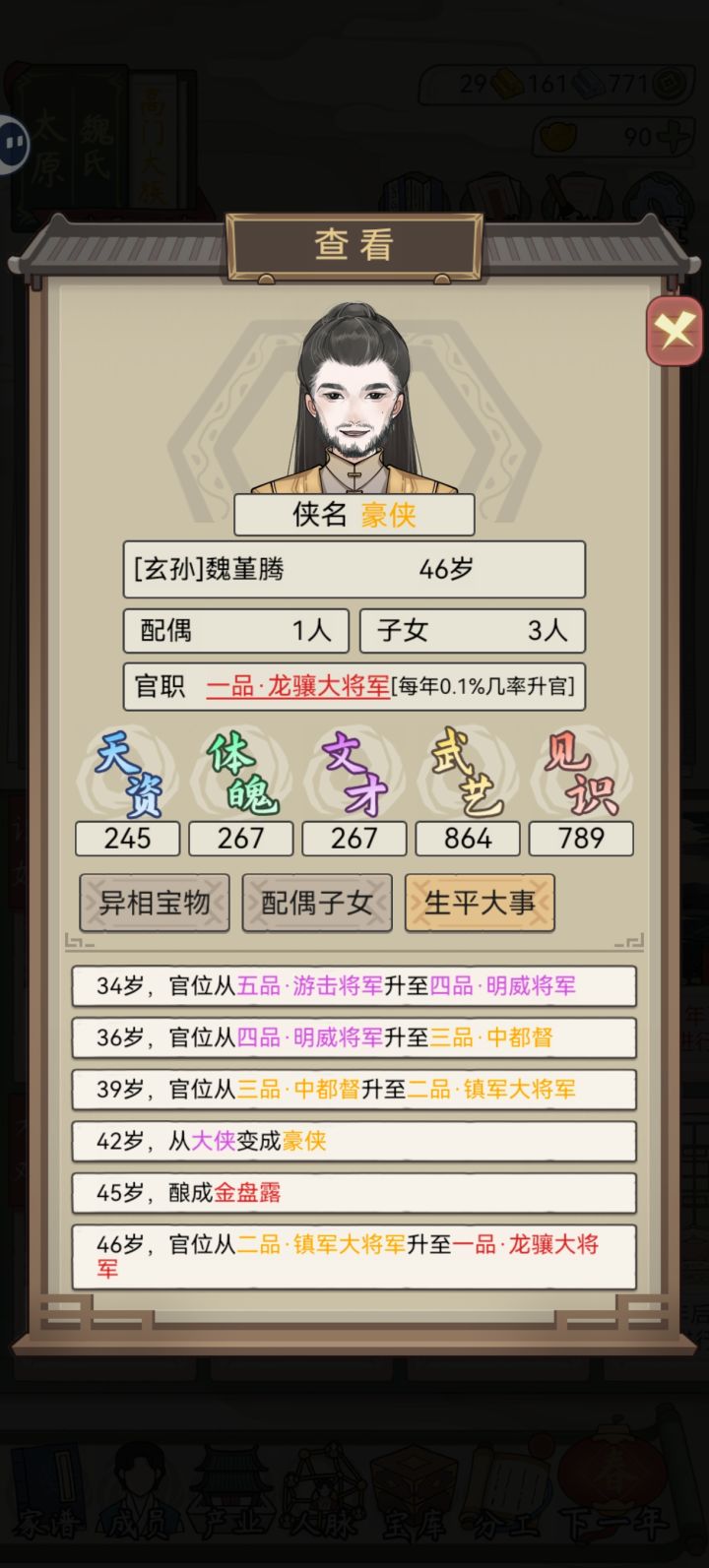 手动调时间收集的元宝最多才到9000,还是不够支撑到名门世族,剩下的就是兑换码还有鼓励生育政策了,留一个收集贴,希望各位大佬也能留下你的兑换码在评论区#兑换码 0广告很难,前期没到年产60银建议还是要投元宝和钱到产业,甚至还要牺牲善举和家族关系,所以尽可能多生多婚,选盛大婚礼直到元宝差不多不够再换成豪华婚礼同时可以控制人口集火当官和论剑大会,寿礼建议只选内定下任家主,主武(异相全武比文高)然后再