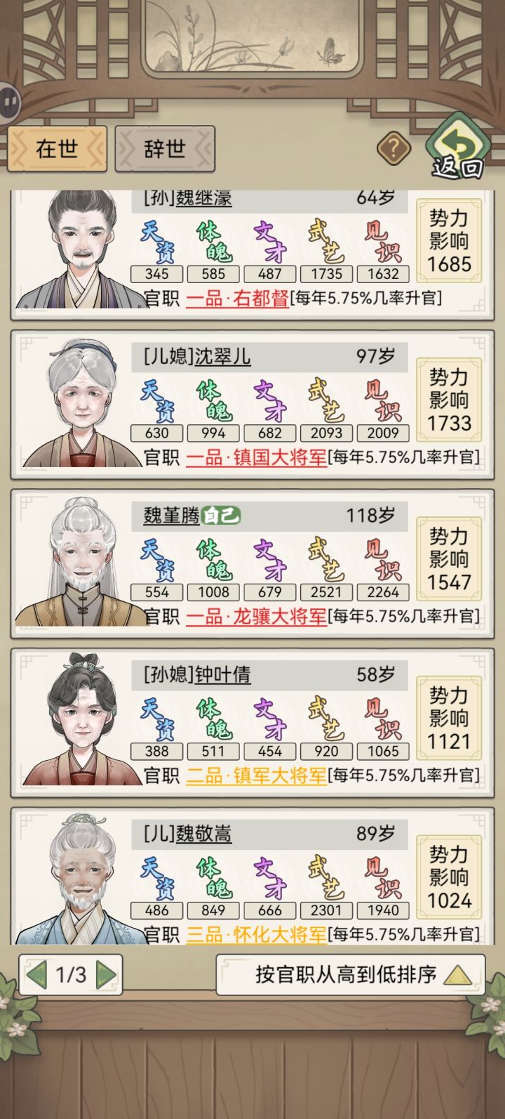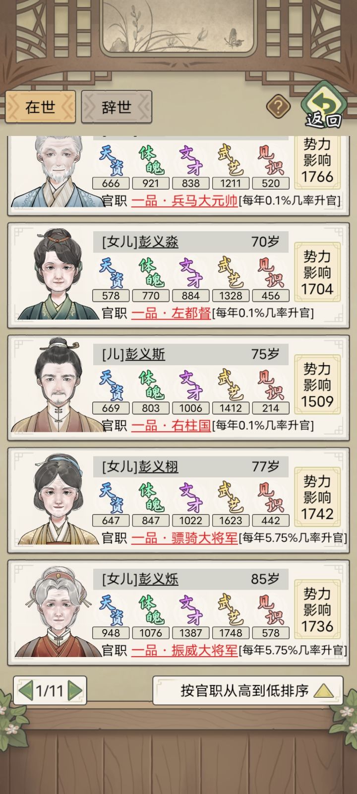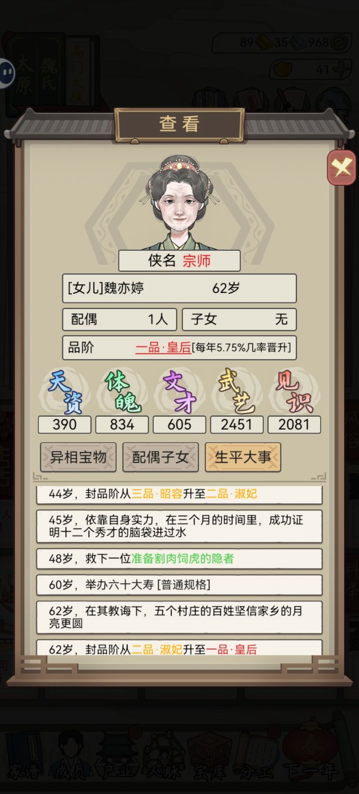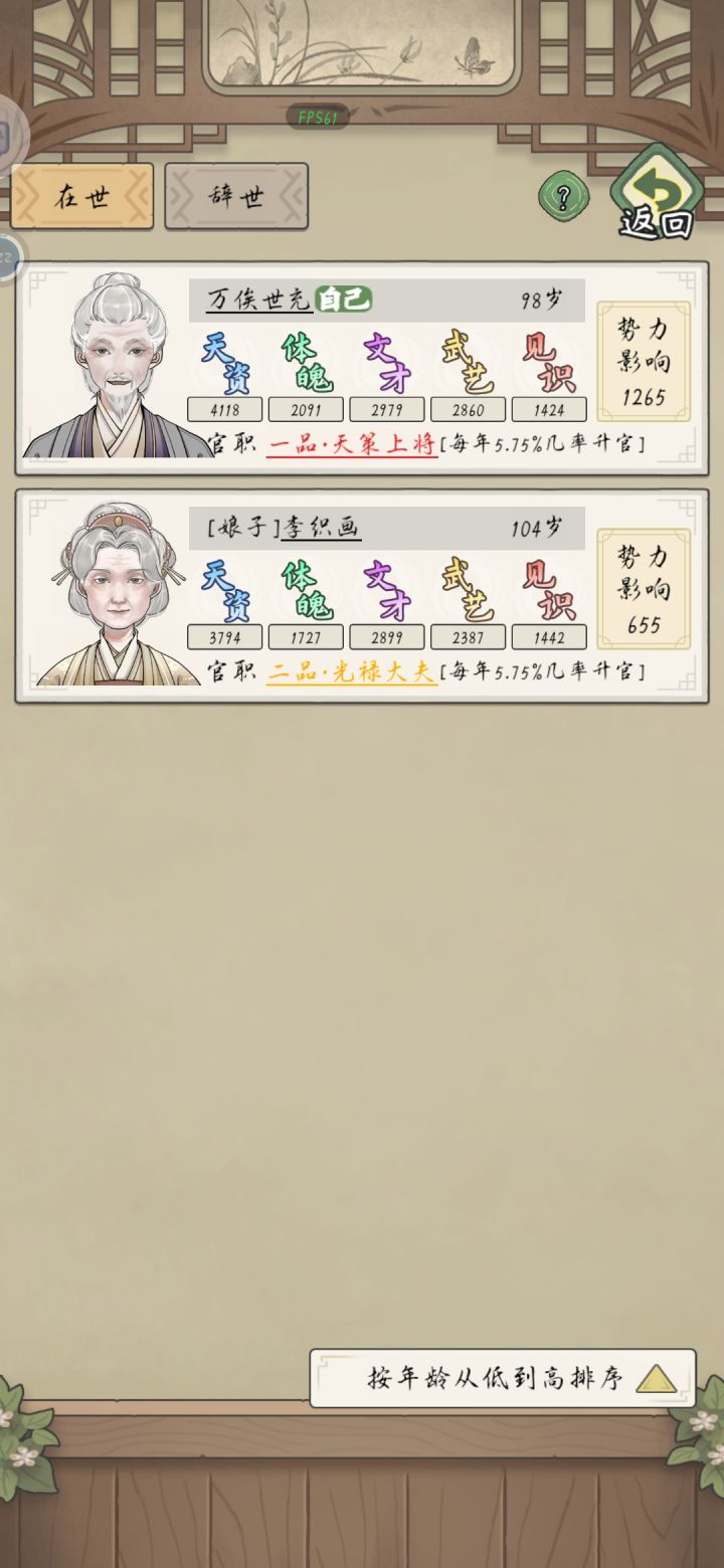 几世才供出来一个皇后从二品到皇后花了十多年,还不能留下后代武官升级就轻轻松松46岁速成一品,家里一排高品武官——非要玩的话1. 压制家族人口,适龄的不急着结婚,让秀女尽可能多地吃到人脉的属性提升;2. 人脉优先选增加见识的;3. 秀女的文才和体魄保持100+,才能参加+见识的两个分工(80岁以后就不能参加远行了,尽可能在这之前把见识拉到1k5以上);4. 选秀前可以