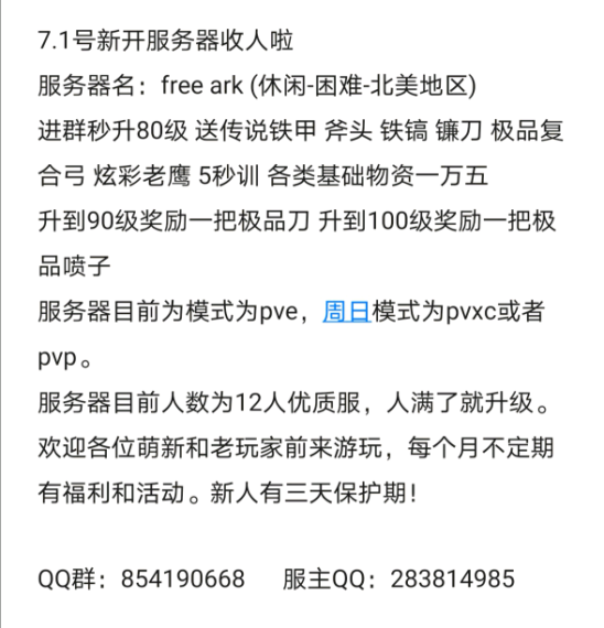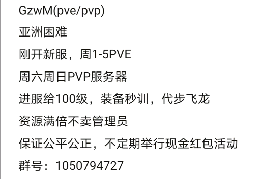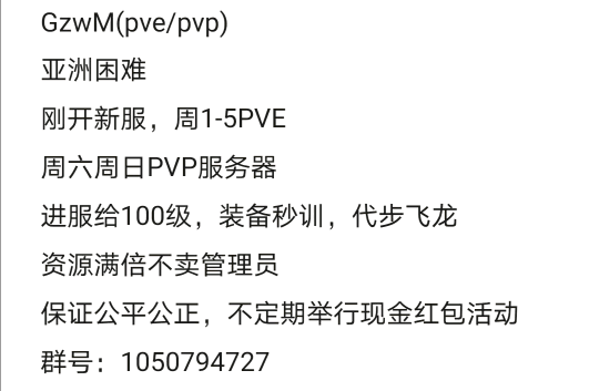 7月份32人优质养老服招人 注意养老的服务器名 jiangshily中等 PVX(pvx是为了方便活动不打架)死亡不掉落开局 一套传说 100级 全程物资靠肝每周都有活动(特别是吃鸡异常刺激)服里部落都很友好,常在线10多人 都会互相帮忙 。还有几个妹子等你撩Qq群号 981577312