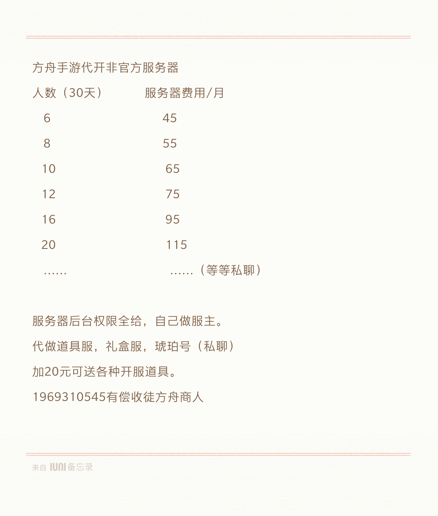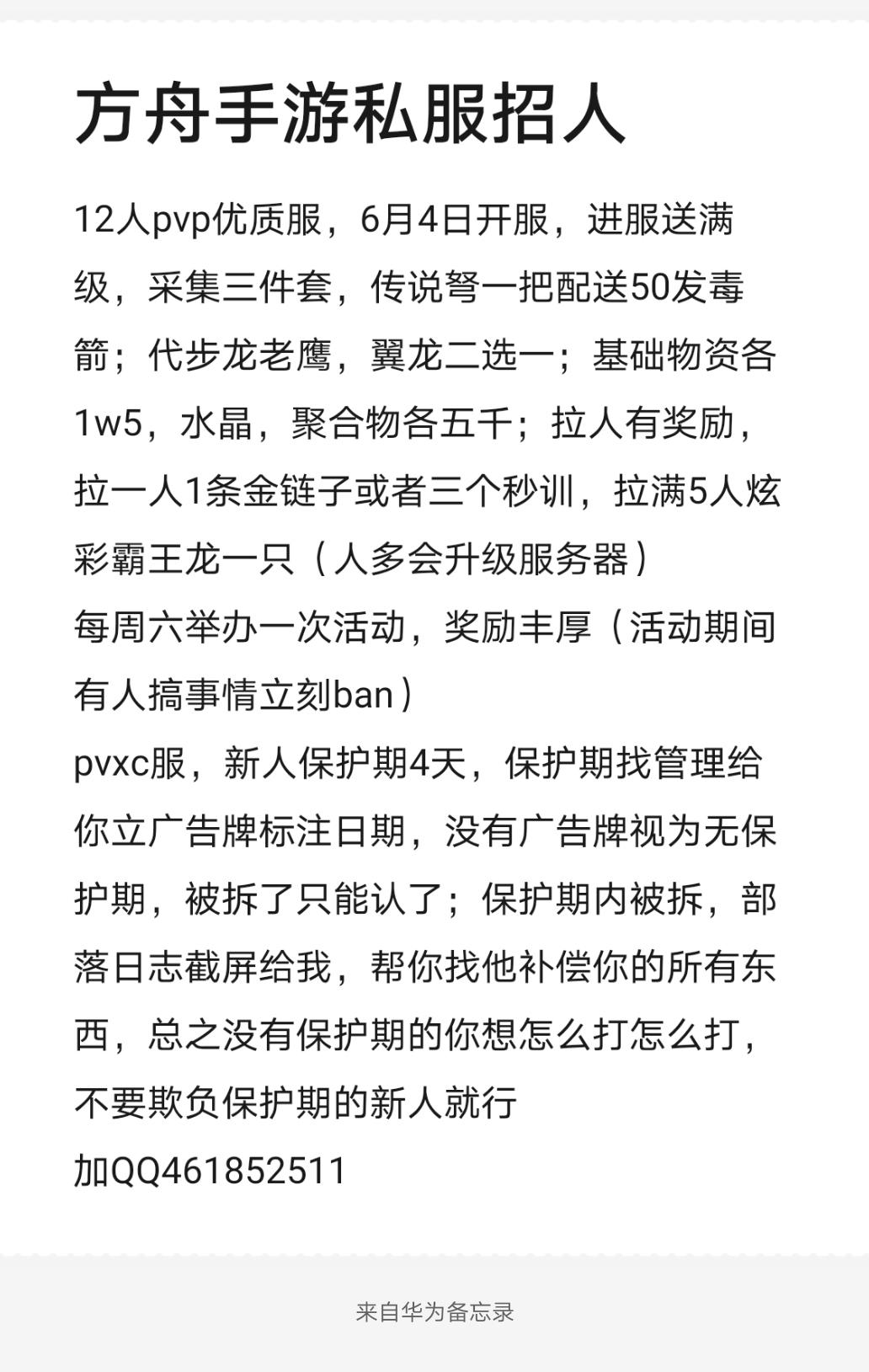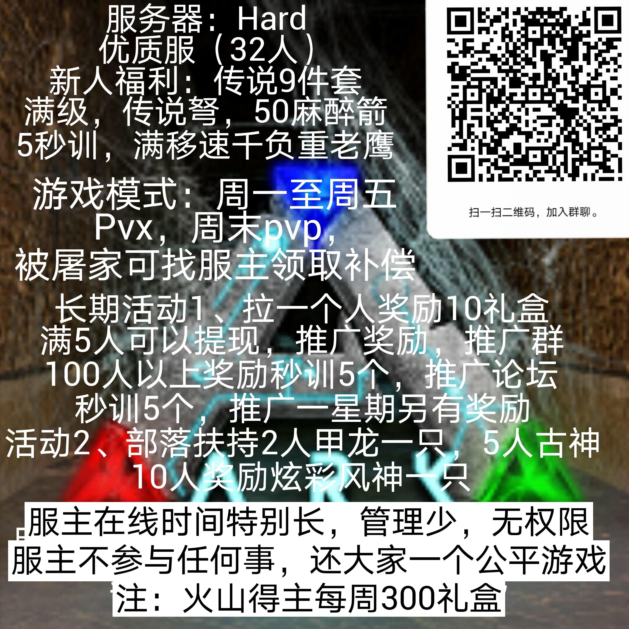你好,我是你们的客服小绿,百人服务器收人,上线送到刀,锅,秒训,前10名送代步老鹰,不给升级,定期举办活动,奖励多多,众所周知,方舟是一款靠肝游戏,氪不氪金无所谓,想要更好的体验你微氪无所谓,服务器不强制你花钱,不送物资,自己肝,所以我希望真正想要去玩儿这个游戏,不图快感来玩儿私服,很多官服玩家看不起私服,因为私服就是所谓的快餐服,本服务器不一样,适合长期在线玩家来肝,管理在线时长较多,所以我希望