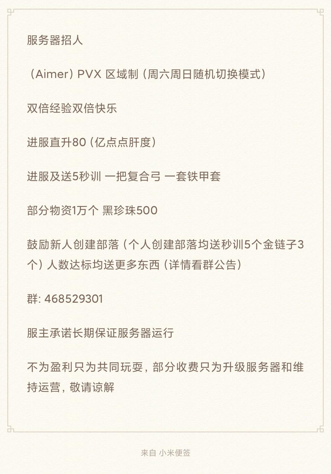 服务器长期开启 最短开到年底 长期服 无管理权限 欢迎养老 欢迎带团当服霸 周日随机更改模式 1-6默认pvx区域制 人数越多活动越频繁萌新创建部落有奖励 即使0氪党都可以玩的很开心另外招收一名长期管理 (需要押金)有管理经验优先 欢迎咨询