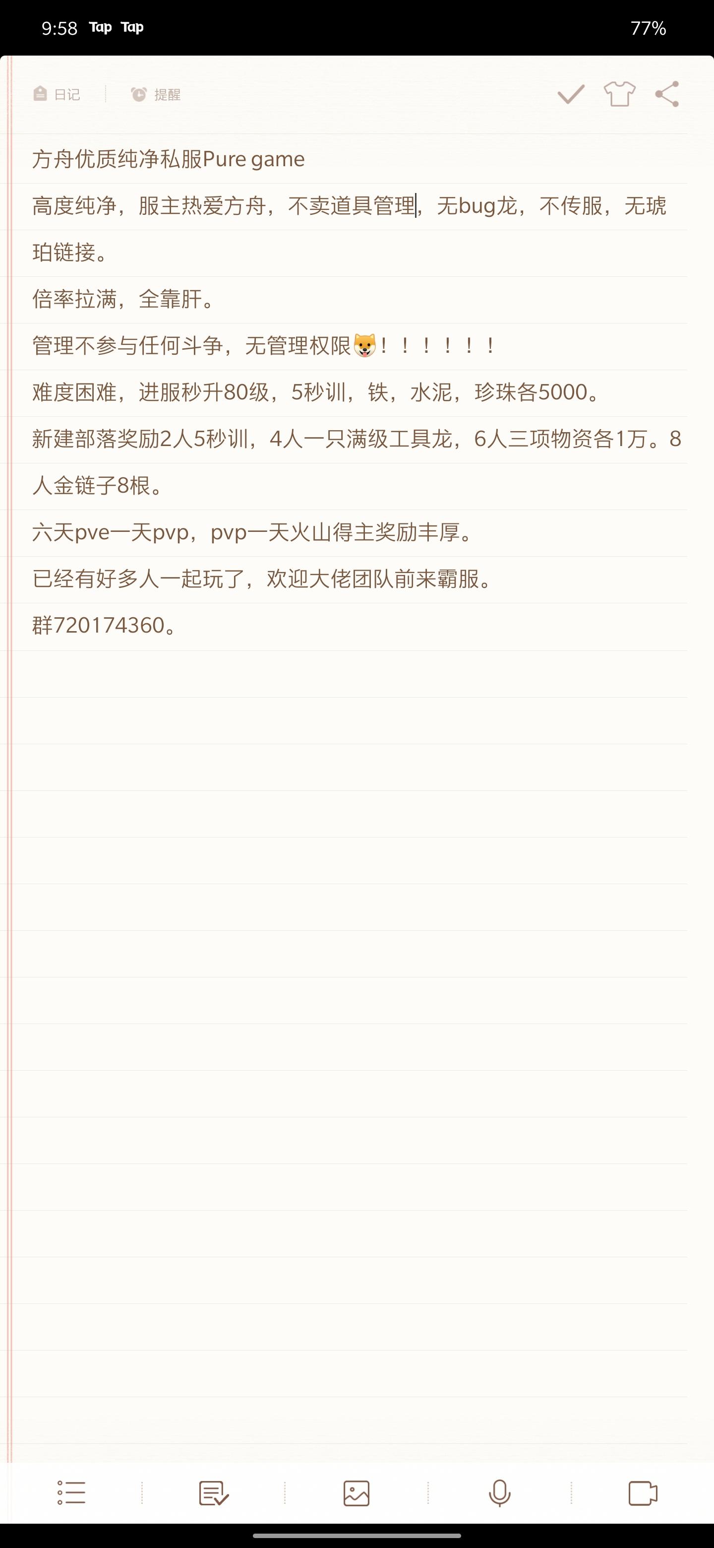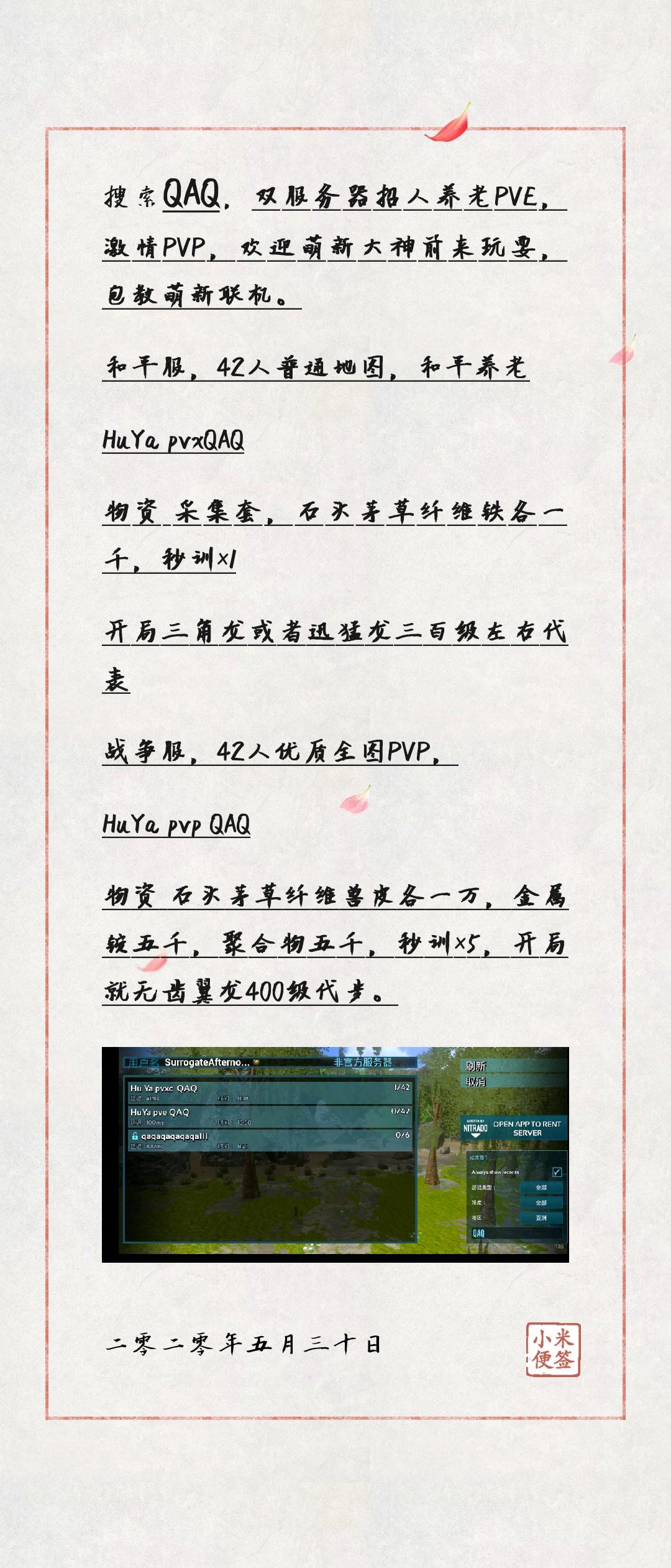 服务器QAQ本服现在招收大量方舟游戏爱好者进服同玩方舟生存进化手游非官方服务器QAQ超低延迟注重氛围新人玩家不用担忧手把手教联机,萌新有福利,管理在线不怕漏级,训龙怕慢我们给加速,充值礼品便宜外加赠品,前期欢乐无忧后期紧张刺激,每月都有吃鸡躲猫猫拳击赌龙等游戏活动我会邀你进入我们QQ群995909833慢慢的玩耍吧(拉人有奖励呦)(推荐人说木匠会有小小的福利哦)