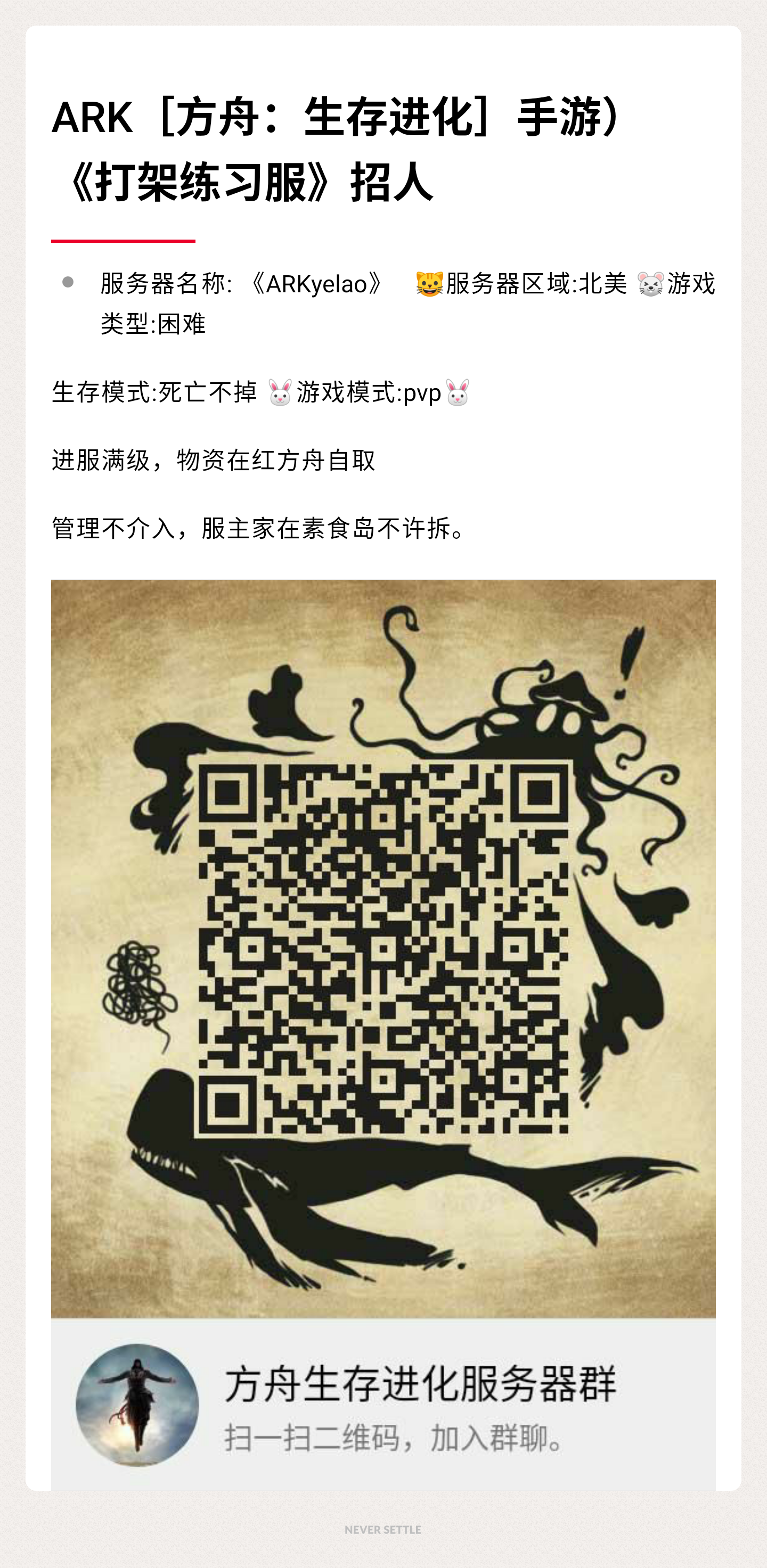 方舟生存进化手游新服招人 服务器信息 服务器china xht 困难模式死亡不掉落 服主不参与竞争,新人升级60,其他自己肝 平时pve周末pvp 游戏里大家都很友好,好相处,都会帮助新人,不定时举行活动。 服主会买礼物作为活动奖品,15倍秒训 黄金项圈 彩虹加特林等,积极参加活动也会发奖励哦😊 新服刚开不久欢迎方舟萌新,大佬养老😊 QQ群:1087213887 沙雕网友等你来😄