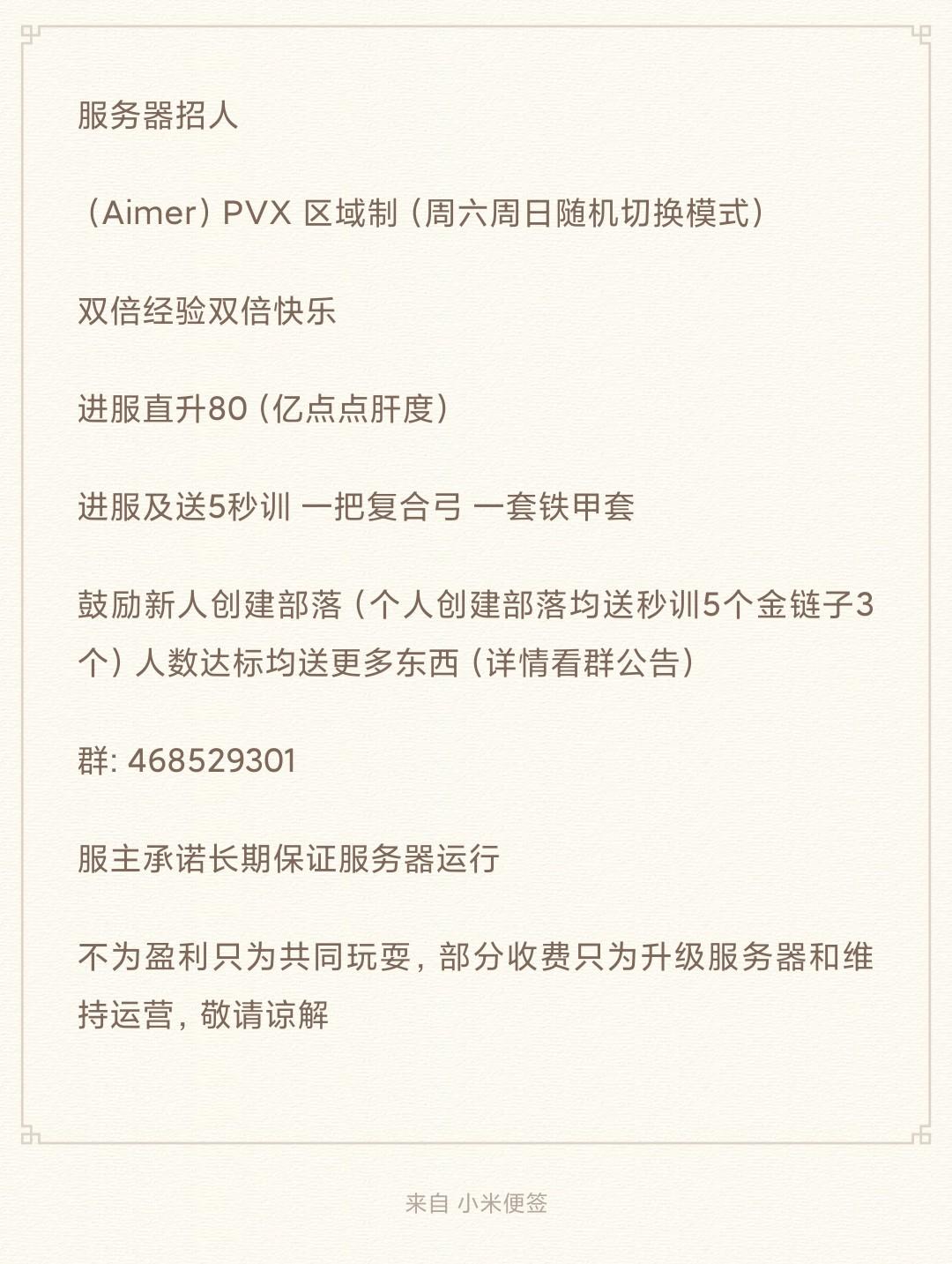 服务器招人(Aimer)PVX 区域制(周六周日随机切换模式)双倍经验双倍快乐进服直升80 (亿点点肝度)进服及送5秒训 一把复合弓 一套铁甲套鼓励新人创建部落(个人创建部落均送秒训5个金链子3个)人数达标均送更多东西(详情看群公告)群: 468529301服主承诺长期保证服务器运行不为盈利只为共同玩耍,部分收费只为升级服务器和维持运营,敬请谅解
