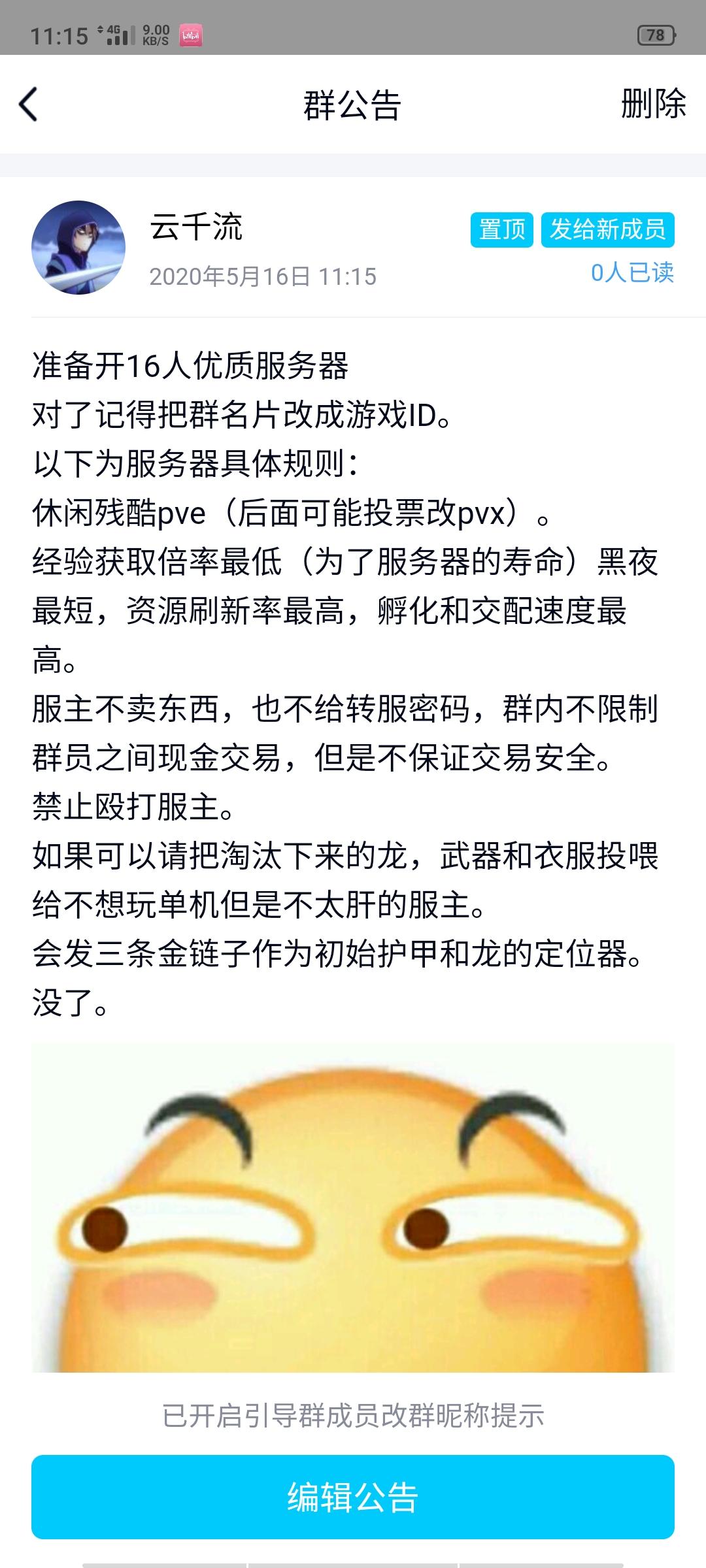 ヾ(❀╹◡╹)ノ~服务器名字 Tough 硬 汉 残 酷!Pve………服务器是纯净服 没有服主管理(谁开挂就顺着网线过去弄死它)不准转服 不存在任何福利 礼盒 等等等等 还有送的资源 全都老实肝吧 原汁原味 ( ▿ )欢迎白嫖党(主要可能我们更穷)(╯‵□′)╯︵┻━┻ 注意!!!本服务器的唯一一个福利!!! 进服可以免费送一套会员通行证和方舟优品!每人都可以有!(玩熟的话…你要是想在别的服务