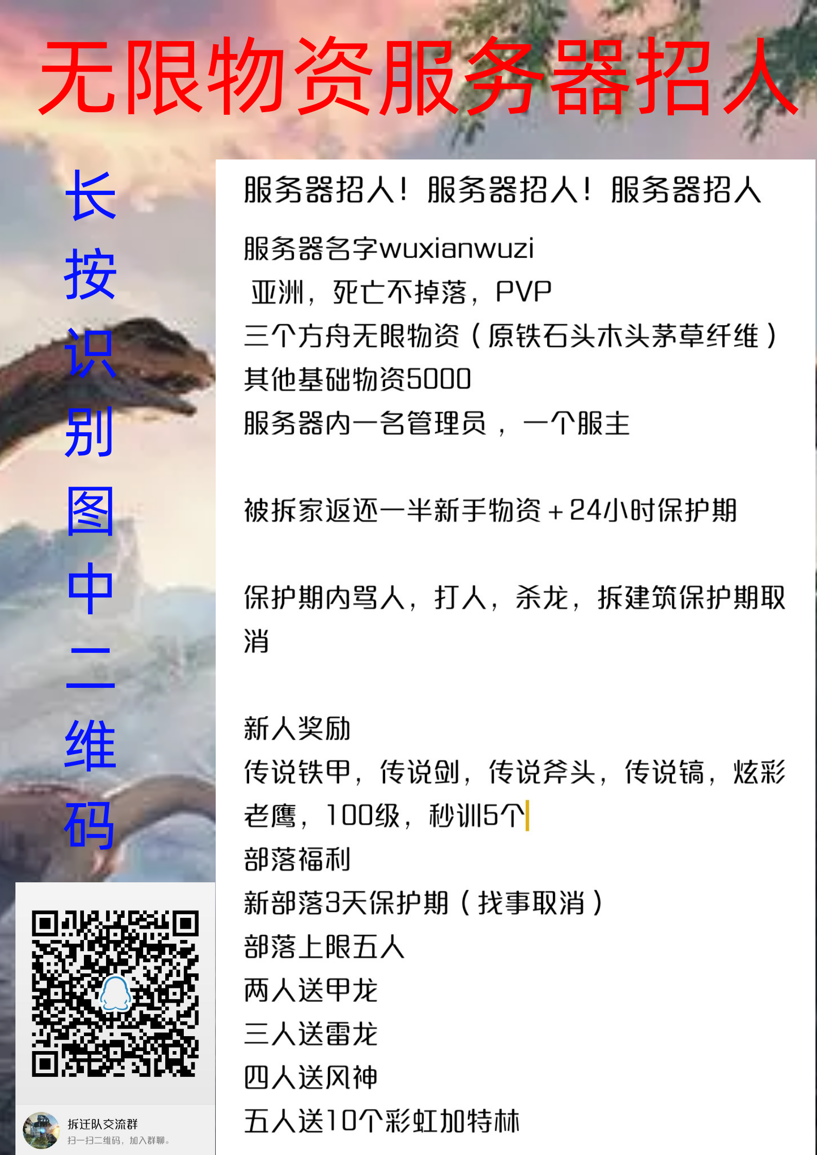 服务器困难PVP模式!玩家群昵称和游戏名要一致, 要不不发物资!新人进服升60级,送传说八件套,送一只老鹰用作代步,老鹰可自行加点!新人进服物资:铁、水泥各2万,其它5000(不包括黑珍珠,鱼油和树脂)物资给多你们就没干劲了!新人保护期为三天,像:服主部落(保护期15号~18号)!新人保护期期间不得攻打别人,否则解除保护期。新人所加部落的保护期结束了的新人保护期也跟着结束。新人保护期期间其